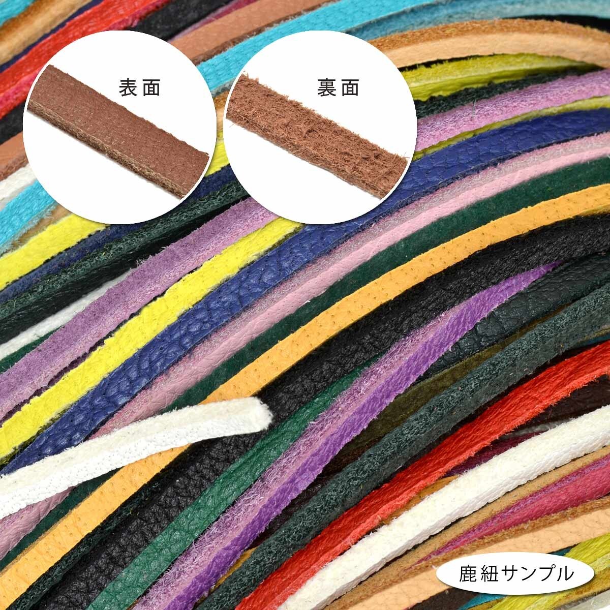 | 表面はすべすべななめし加工、裏側はスウェードのような柔らかい肌触りの起毛加工が施されたシカ革の平紐(ディアスキン)。鹿の革は丈夫なのに柔らかく肌触りが良いので、高級品とされています。ネックレスやペンダントトップなどの他、アイデア次第で様々な用途にお使い頂けます。 |