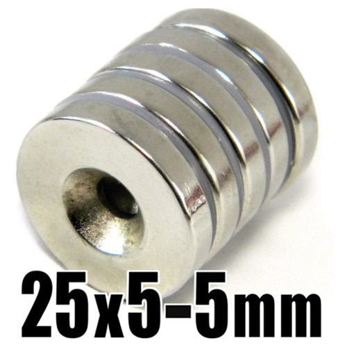 ◆ ネオジム 磁石 ◆ 超強力 穴あき 丸形 ◆ 直径25mm x 厚み5mm(ネジ穴 5mm) 【5個】