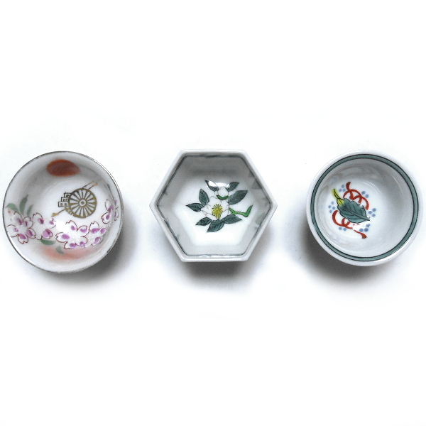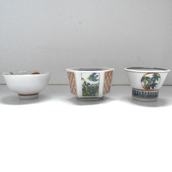 ご覧いただきありがとうございます。当商品は、九谷焼 美陶等 盃 大砲文様 葉文様 花文様 3種です。大きさは、大砲文様が直径約5.8cm×高さ約3.1cm。底径が約2.4cm。葉文様が直径約5.2cm×高さ約3.7cm。底径が約3.0cm。花文様が直径約5.8cm×高さ約3.6cm。底径が約3.0cmです。040307R