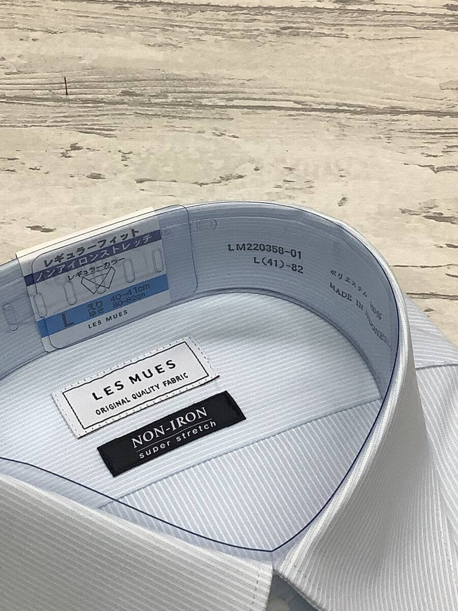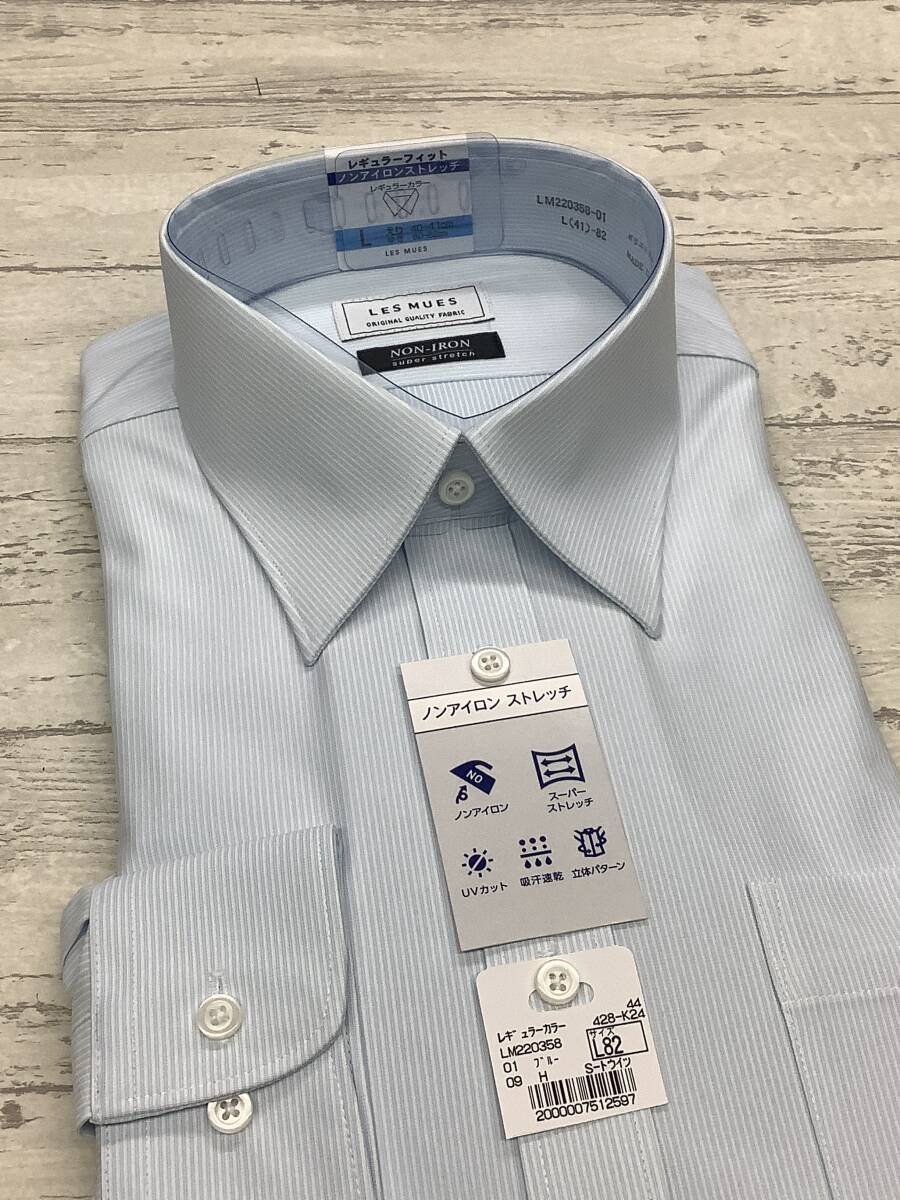 ★41-82長袖Lサイズ レギュラーカラー★ブルー 細かいストライプ柄、定価4,990円 ノンアイロン スーパーストレッチ