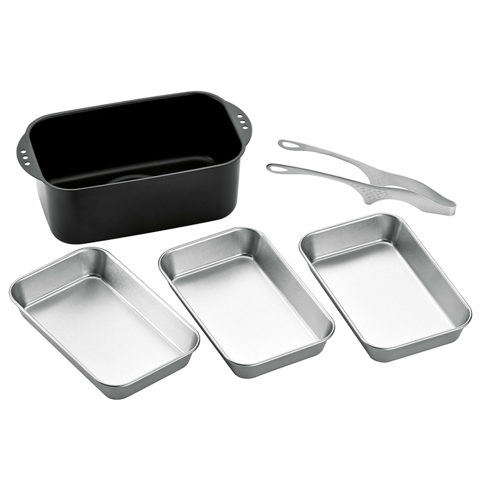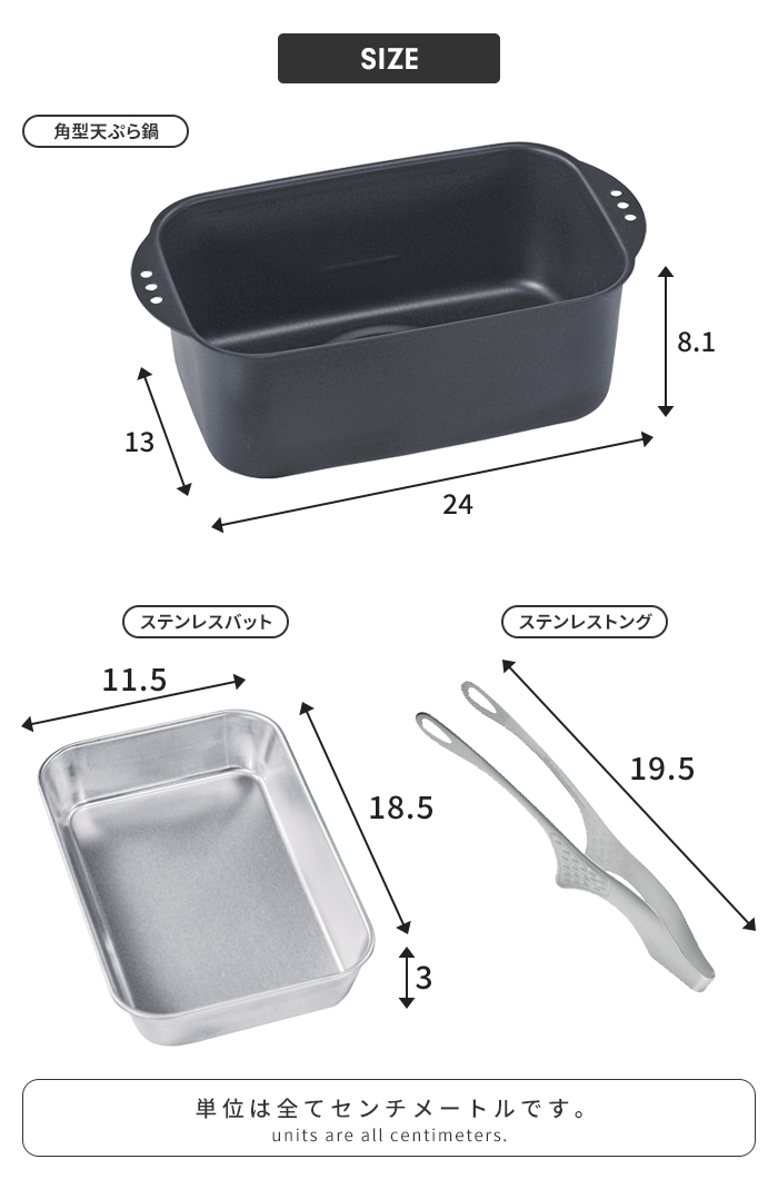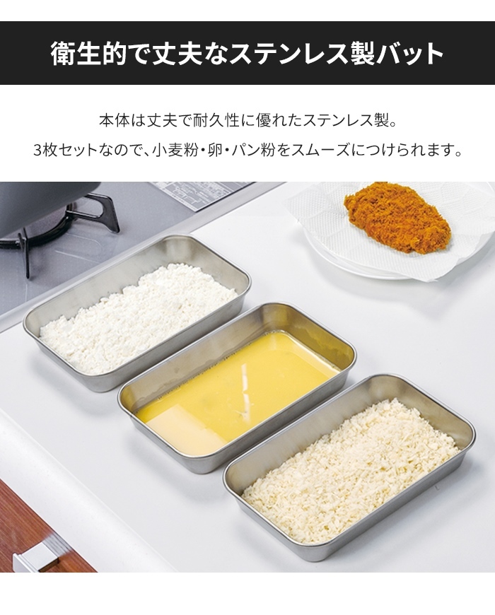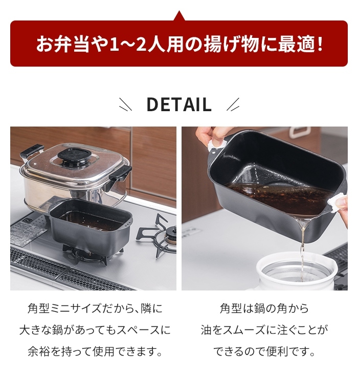 | ・角型ミニサイズで少量の油で調理可能 ・便利なバット3枚付きでスムーズに揚げ物できる |
