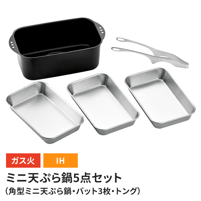 | 角型天ぷら鍋 バット3枚 トング 5点セット ガス火 IH オール熱源対応 揚げ物鍋 角型 ステンレスバット キッチンツール 便利 ミニミニ天ぷら鍋 てんぷら鍋 鉄鍋 角型ミニサイズ セット品 日本製 オール熱源 調理器具 コンパクト 省スペース 調理 料理 お弁当作り 揚げ物 天ぷら キッチン 台所 |