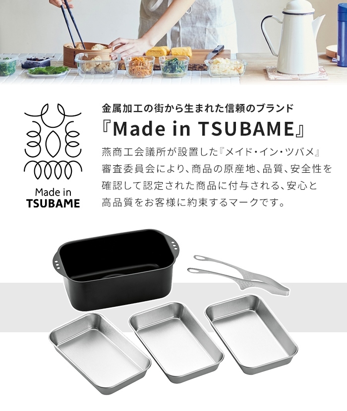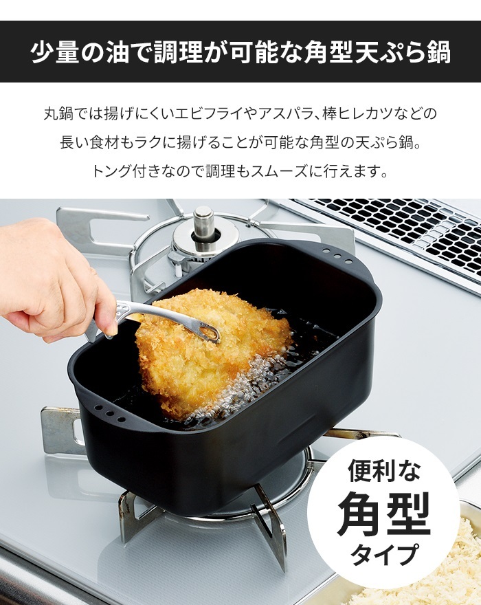 | 少量の油で調理が可能! 角型ミニサイズの天ぷら鍋にバット3枚&トングが付いたセットで揚げ物調理がスムーズに。 お弁当や1~2人用の揚げ物に最適。 エビフライやアスパラなど長い食材も楽に揚げられます。 [特長] ・便利なバット3枚付きで、小麦粉・卵・パン粉をスムーズにつけられます。 ・丸鍋では揚げにくいエビフライやアスパラ、棒ヒレカツなどの長い食材も楽に揚げれます。 ・角型ミニサイズだから、隣に大きな鍋があってもスペースに余裕をもって使用できます。 ・角型だから鍋の角から油をスムーズに注げます。 |