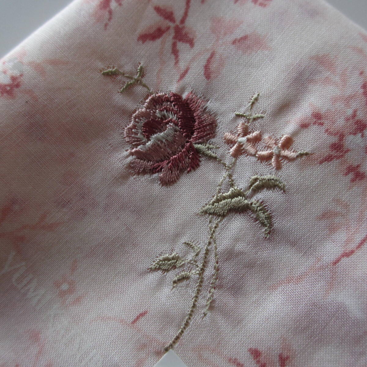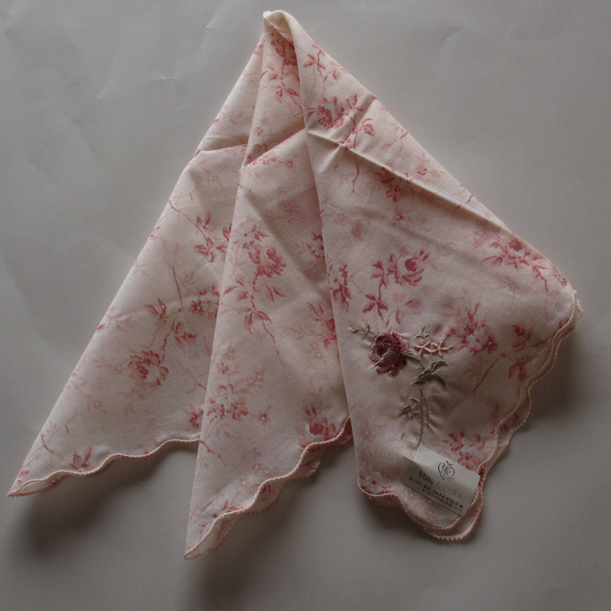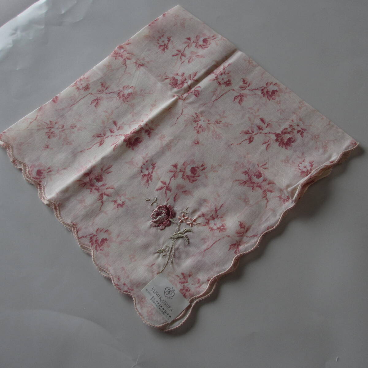 透け感のある薄いピンク地に総柄花模様のなハンカチです。(日本製)。