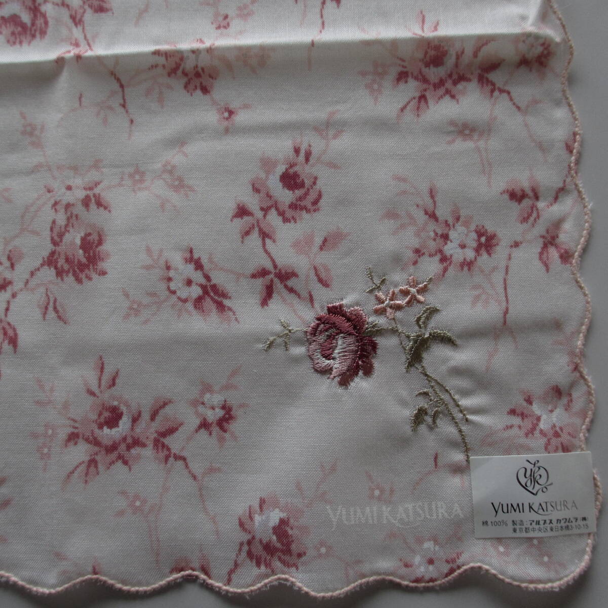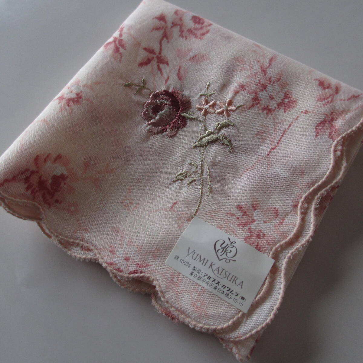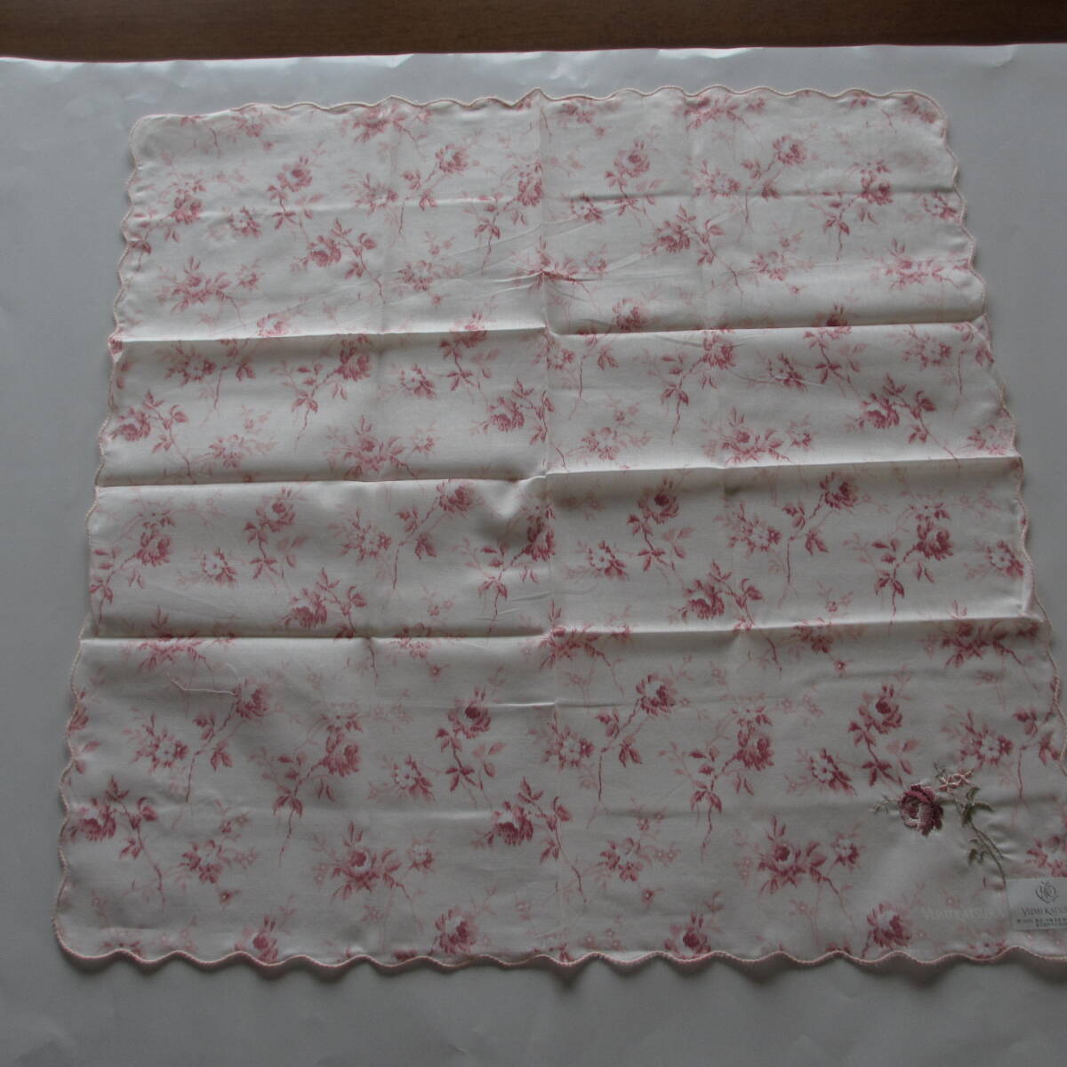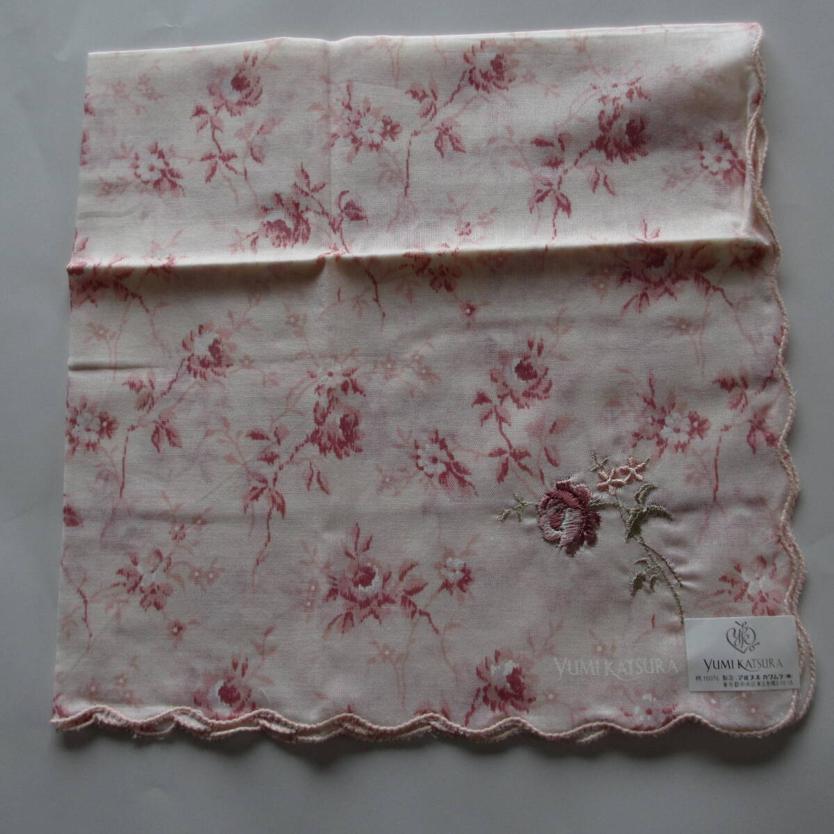 透け感のある薄いピンク地に総柄花模様のなハンカチです。(日本製)。