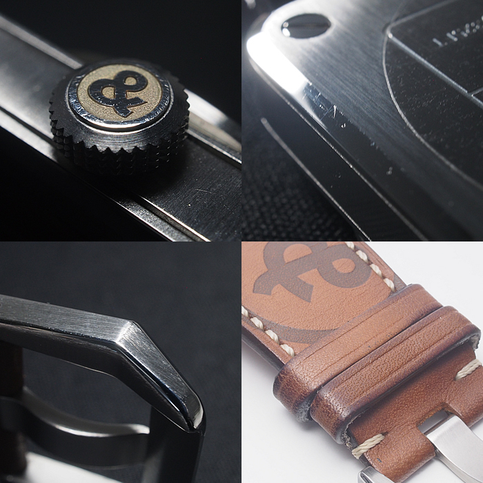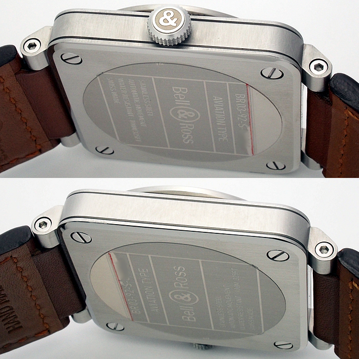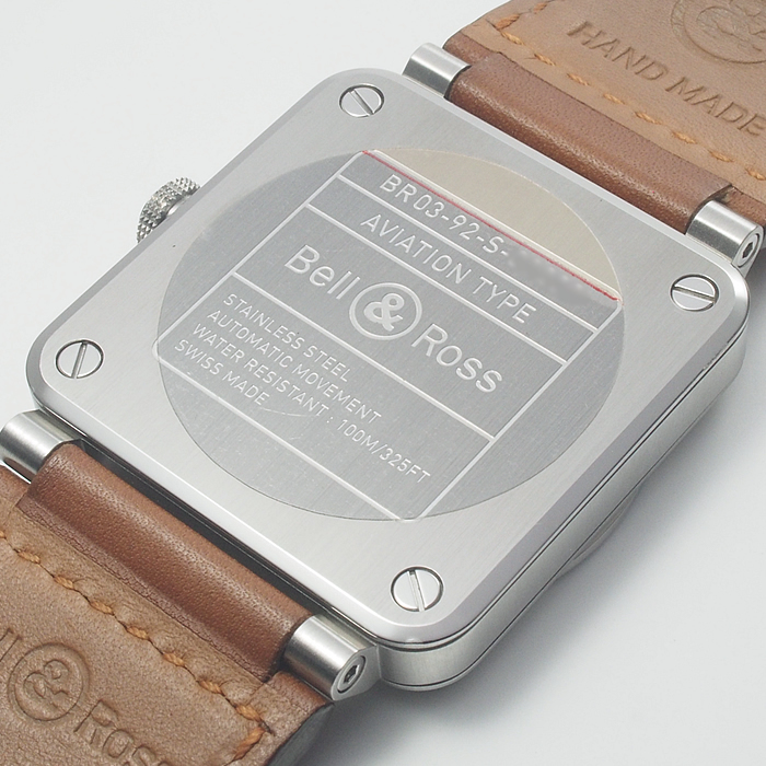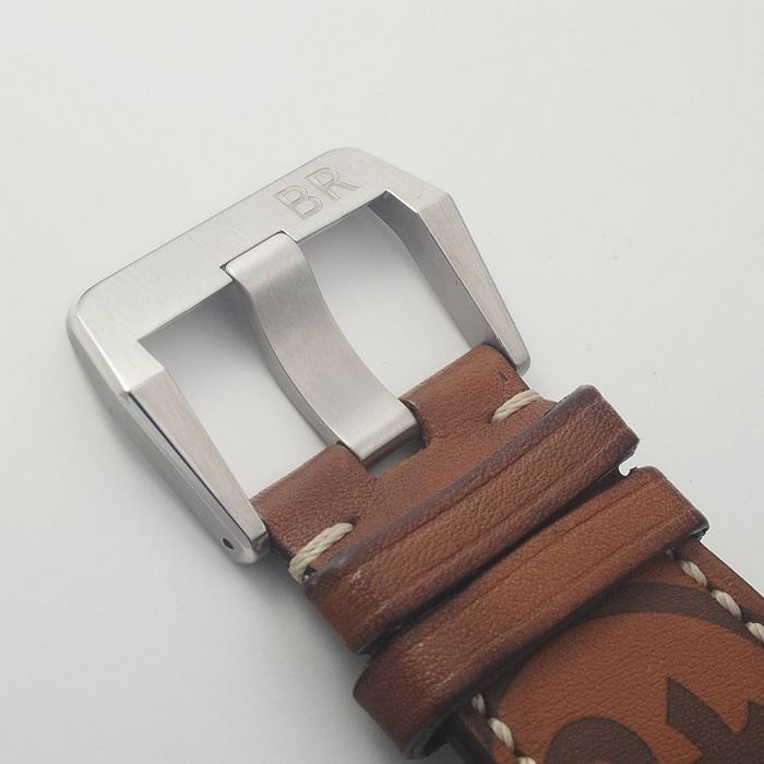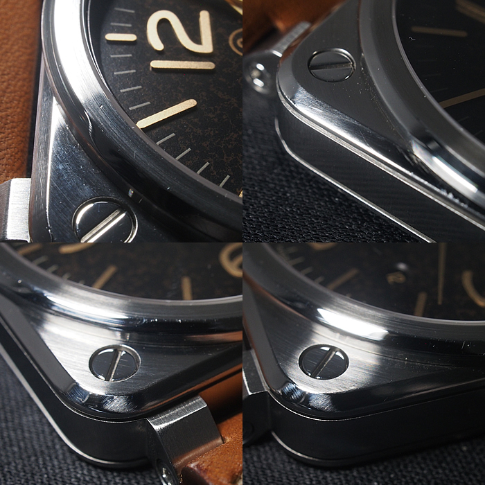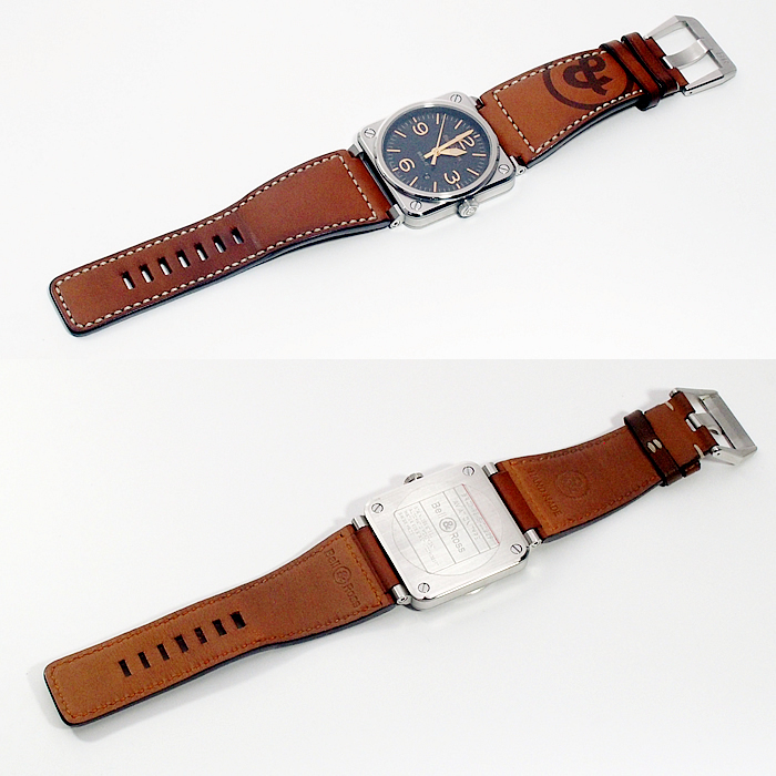 備考:飛行機のコックピットに装備された計器をモチーフにしたスクエアケースが特徴の「BR」シリーズ。エイジング加工が施されたブラックダイヤルにゴールドの針とインデックスを合わせた、ヴィンテージ感漂う一本です。バンドにスレ・汚れ・金具跡・穴の広がりがあり使用感がございます。ベゼルに小傷、その他小スレがございますが、通常使用でお気兼ねなくご使用いただけるお品となっております。