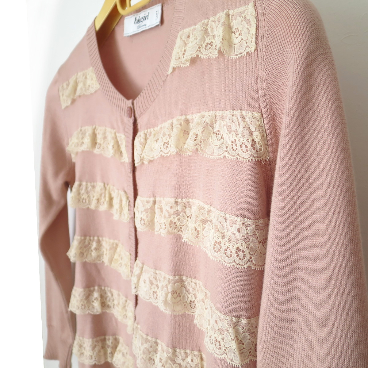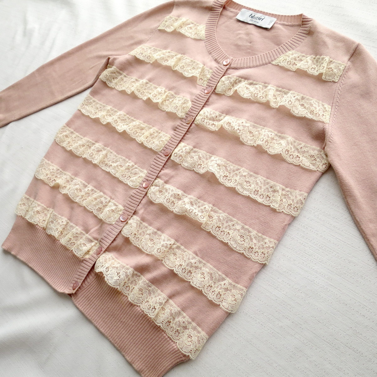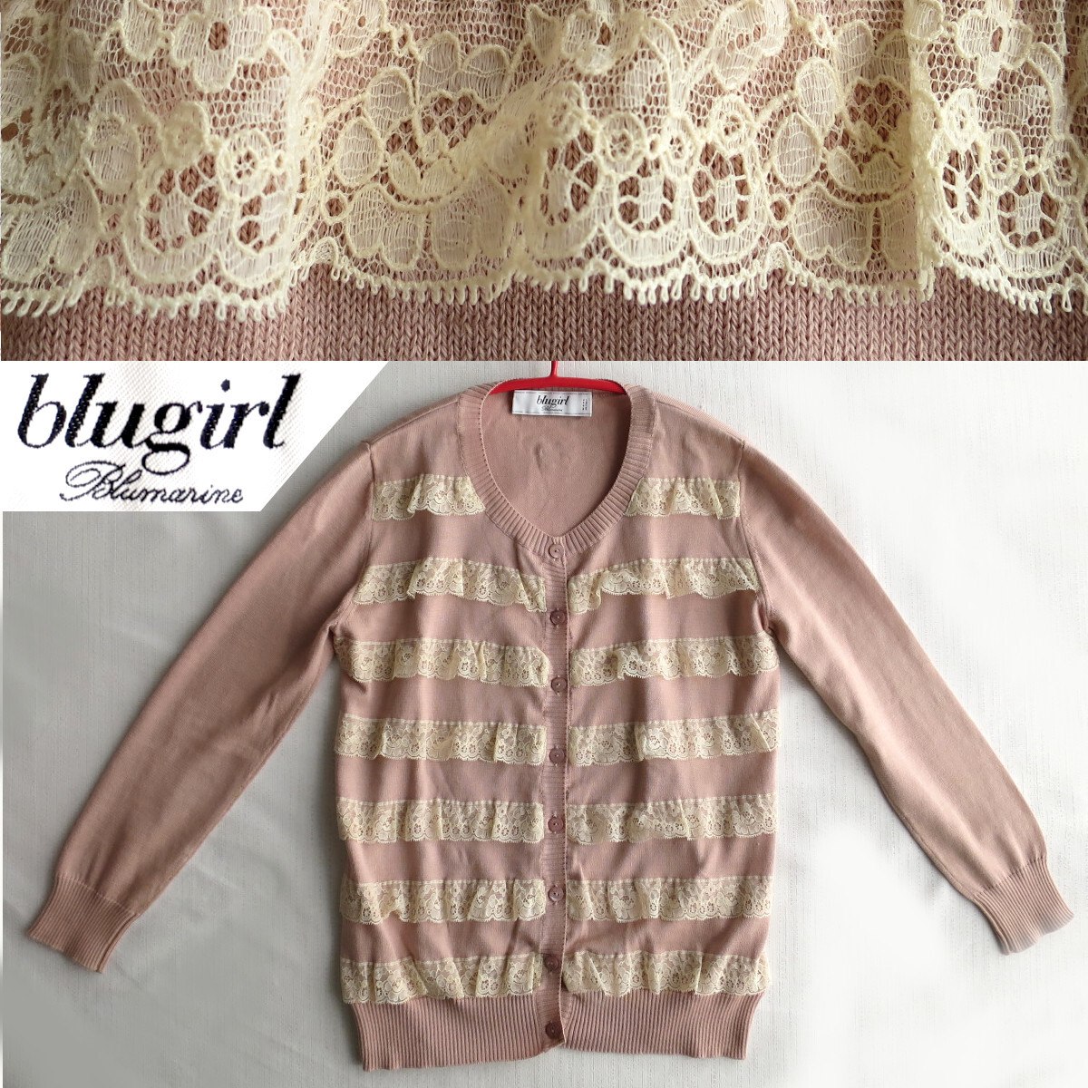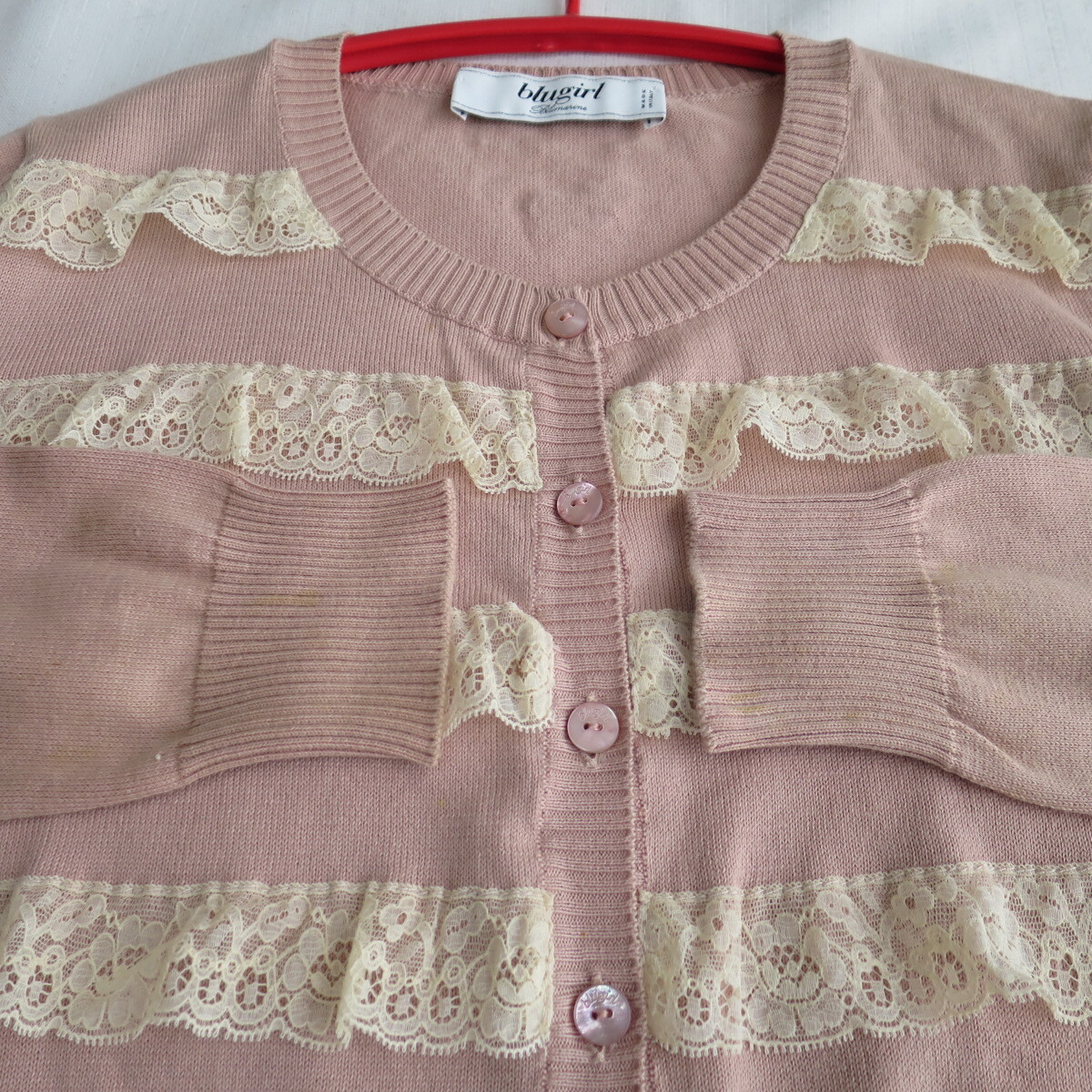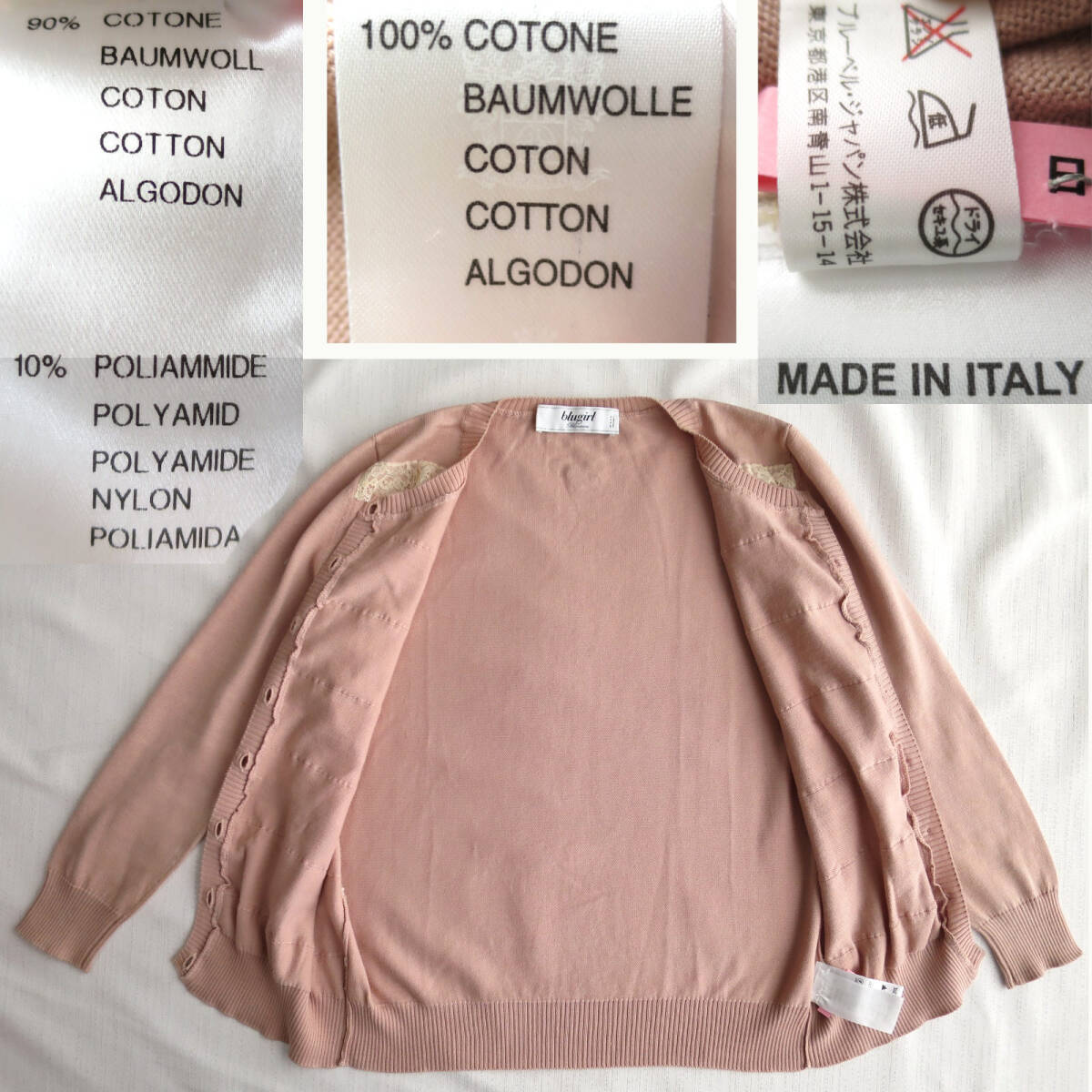【素材】本体ニット/コットン100%レースブレード/コットン90%+ナイロン10%【色】本体ニット/彩度低めの薄ピンクベージュ色レースブレード/オフホワイト~きなり【原産国】 イタリア製