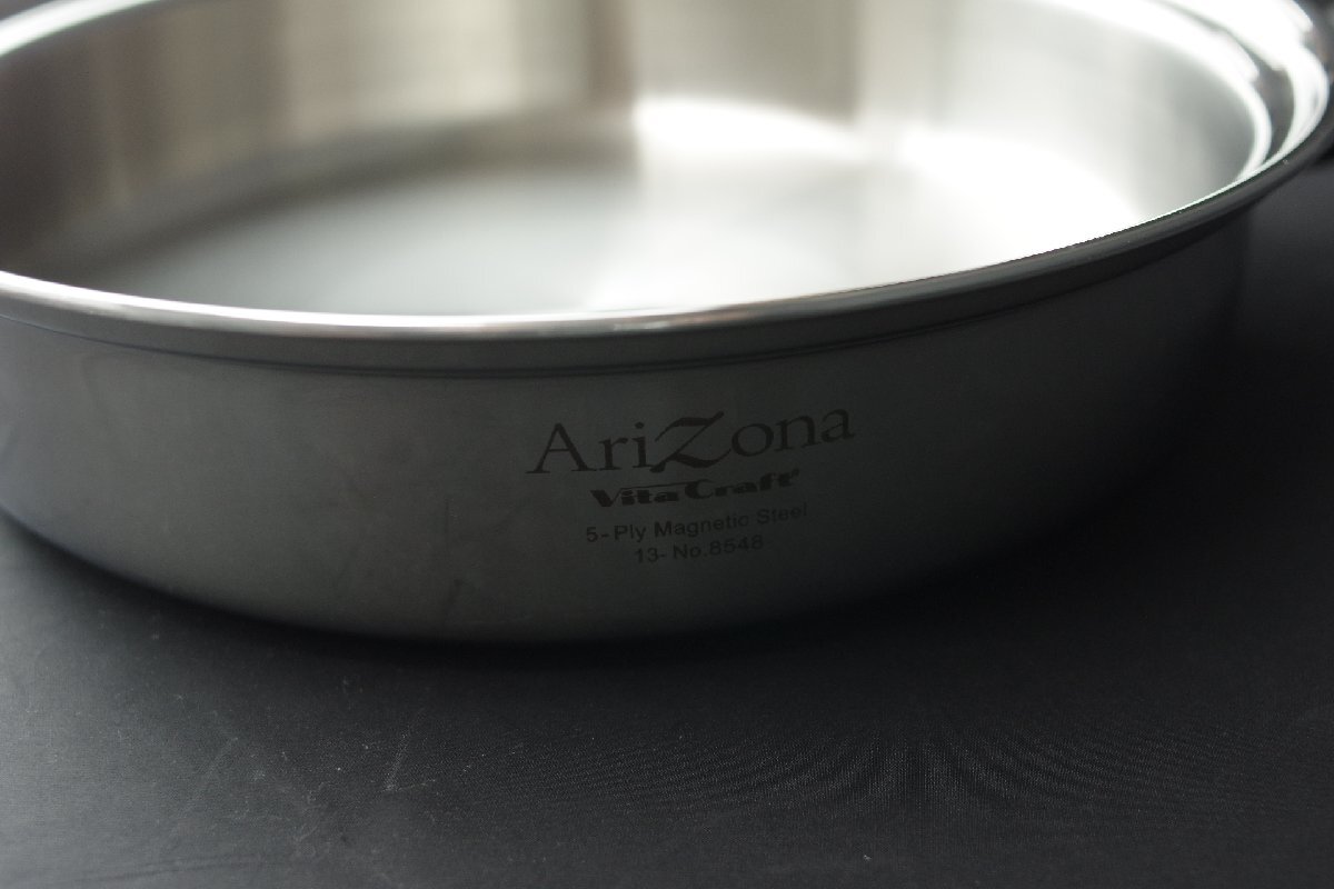| 【商品紹介】 ビタクラフトより アリゾナ フライパン 27cm のご紹介です。 熱伝導がよく、熱ムラがないステンレス全面5層構造。 ガスはもちろんIHクッキングヒーター(電磁調理器)にも使用可能で、ベイパーシール効果により、野菜のもつ水分だけで調理をする無水調理が可能。 油無しでお肉を焼く無油調理、全面多層構造の保温力を活かした余熱調理など様々な調理法が可能で大活躍間違いなしです。 ヘルシー&省エネクッキングができるので健康志向の方だけでなく主婦(夫)の強い味方になりそうです。 この機会にぜひご検討下さい。 【コンディション】 未使用品です。 ・底面に多少キズが見られますが、ご使用には問題ありません。 ・全体的に美観を損ねるようなダメージは見られませんので、気持ちよくご利用いただけるコンディションとなります。 ※清掃、撮影時に目立つ箇所を抜粋して写真掲載しておりますが、同等の傷などがあるものとご了承ください。尚、商品ページの追加写真にて状態をご確認の上、ご検討いただけますよう、お願いいたします。 この他にも商品を多数出品しておりますので、こちらから御覧下さい。 | ||