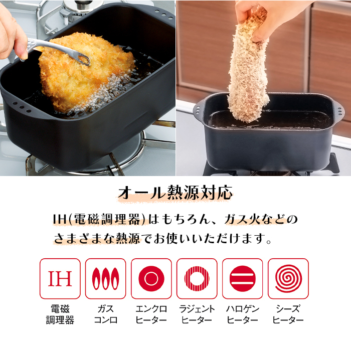 丸鍋では揚げにくいエビフライやアスパラ、棒ヒレカツなどの長い食材も楽に揚げられます。