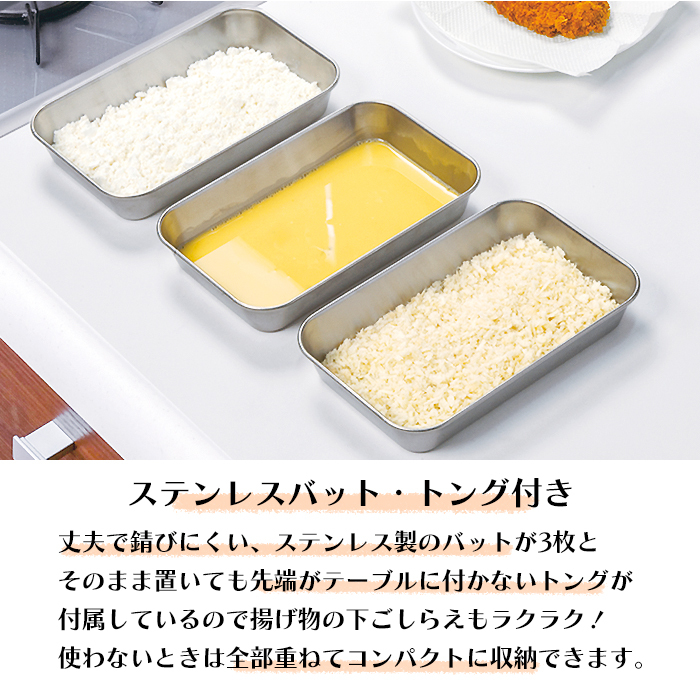 便利なバット3枚付きで、小麦粉・卵・パン粉をスムーズにつけられます。