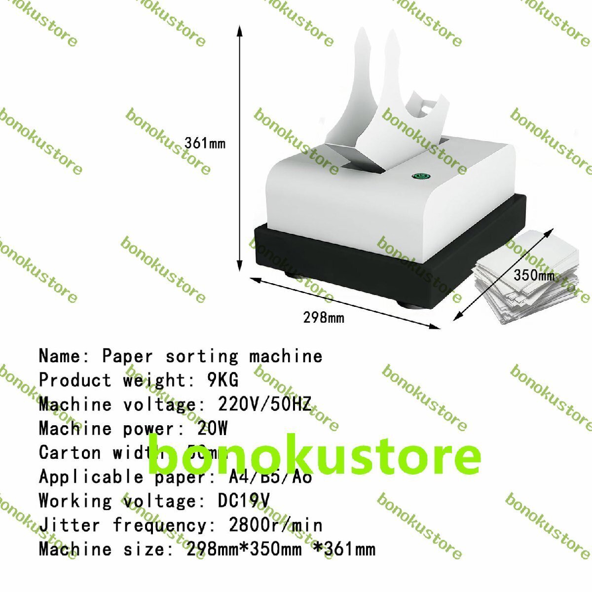 名前: 紙仕分け機 製品重量: 9KG マシン電圧: 220V/50HZ マシンパワー: 20W カートン幅: 50mm 適用用紙:A4/B5/A6 動作電圧: DC19V ジッター周波数: 2800r/分 機械サイズ:298x350x361mm