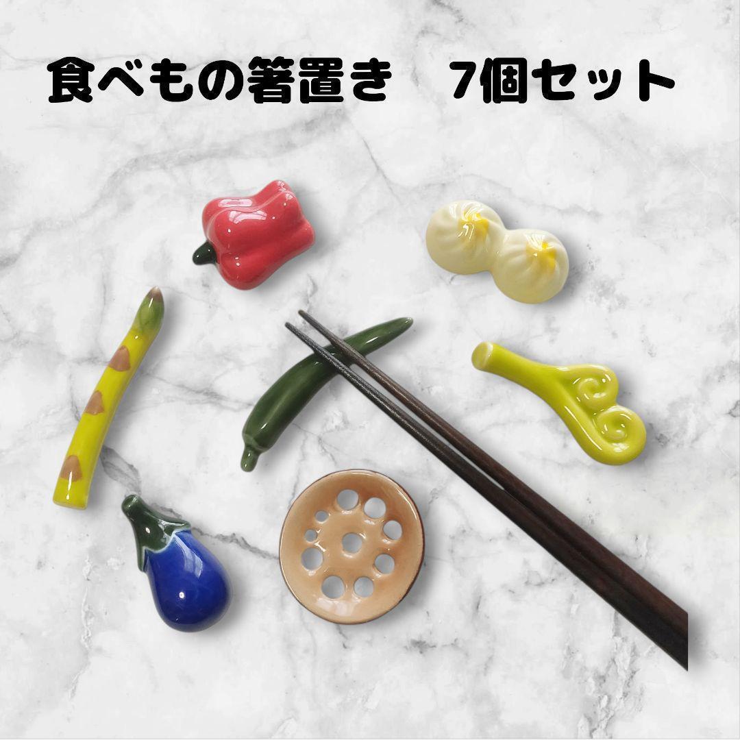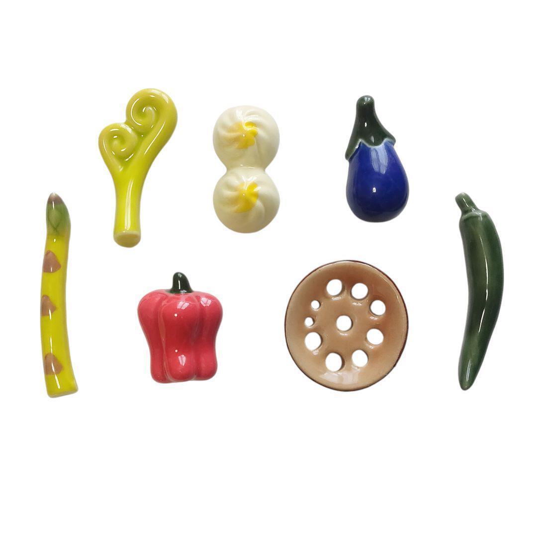 色々な食べ物(小籠包、パプリカ、青唐辛子、茄子、アスパラガス、レンコン、ワラビ)がモチーフのユニークな箸置きの7点セットです。