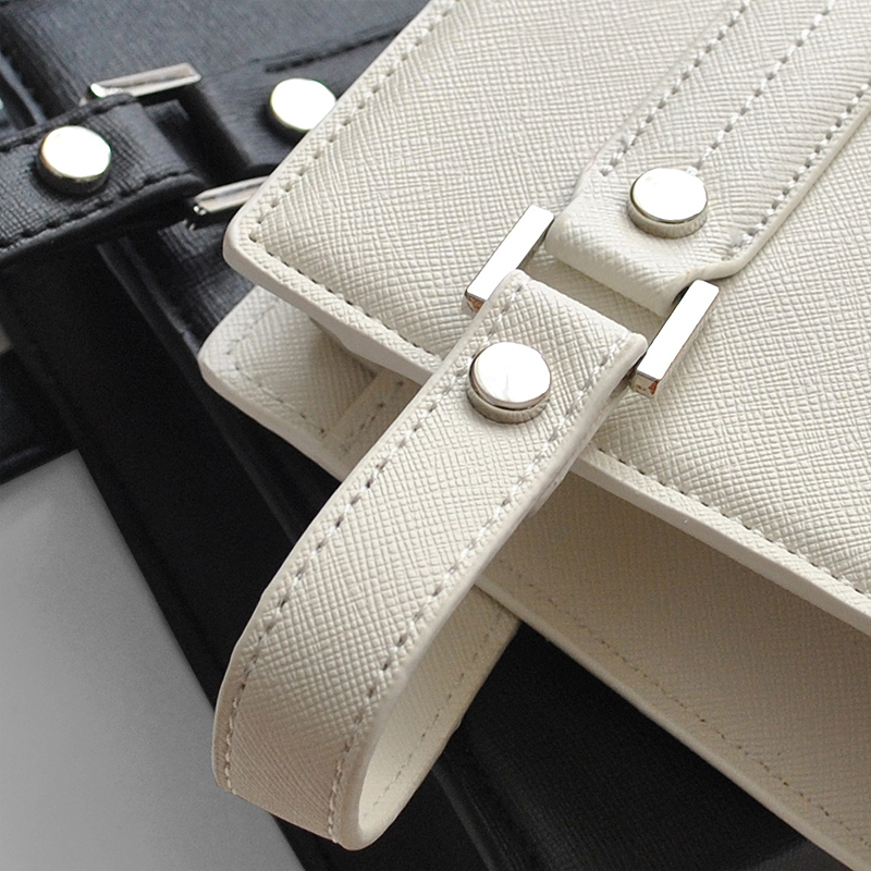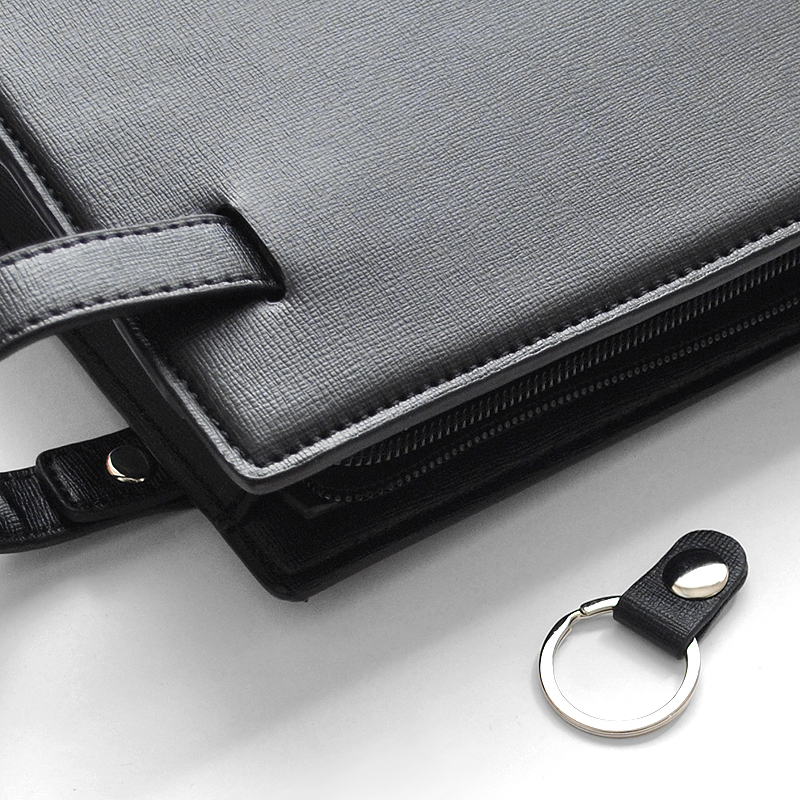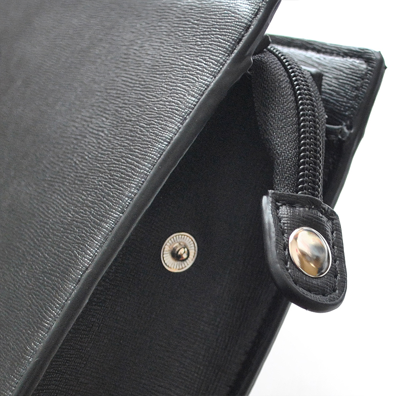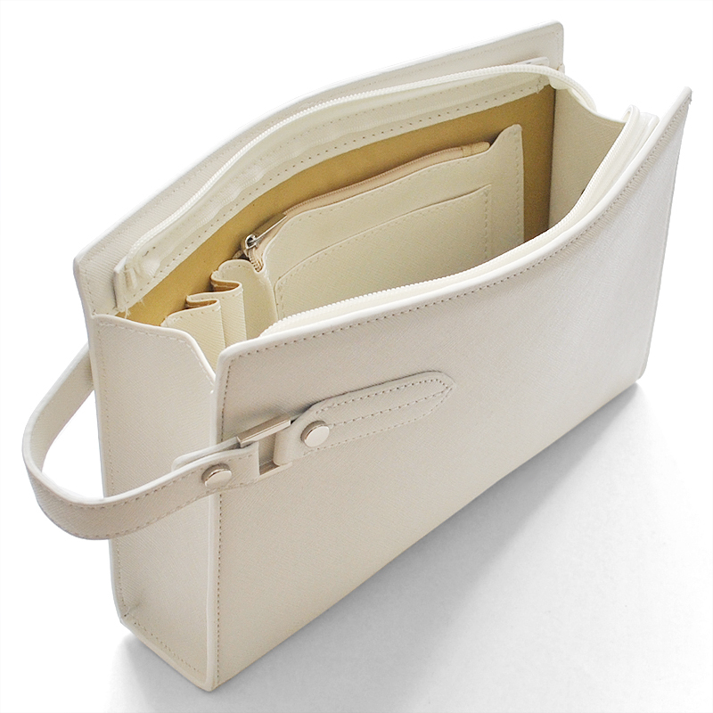 内部にはZIP式ポケット、ペンホルダー、キーリング、カードポケット、大口ポケットを完備しており使用頻度の高いカードケースや定期入れ等の小物類を収納しておくと大変便利です。
