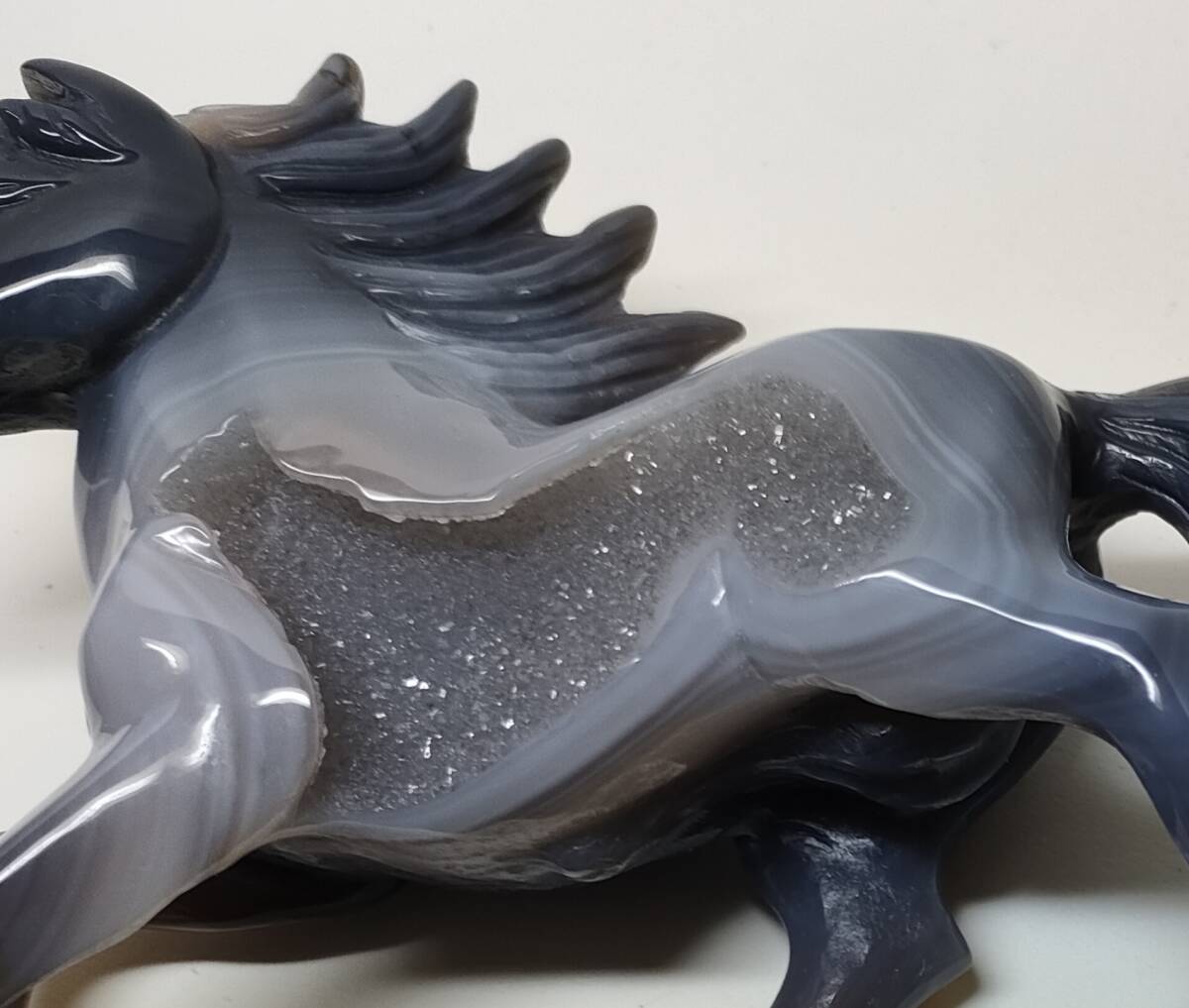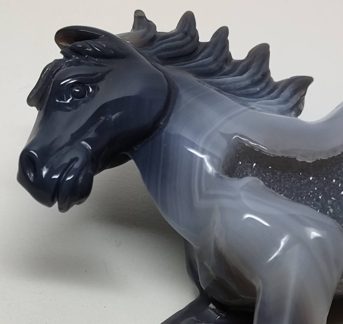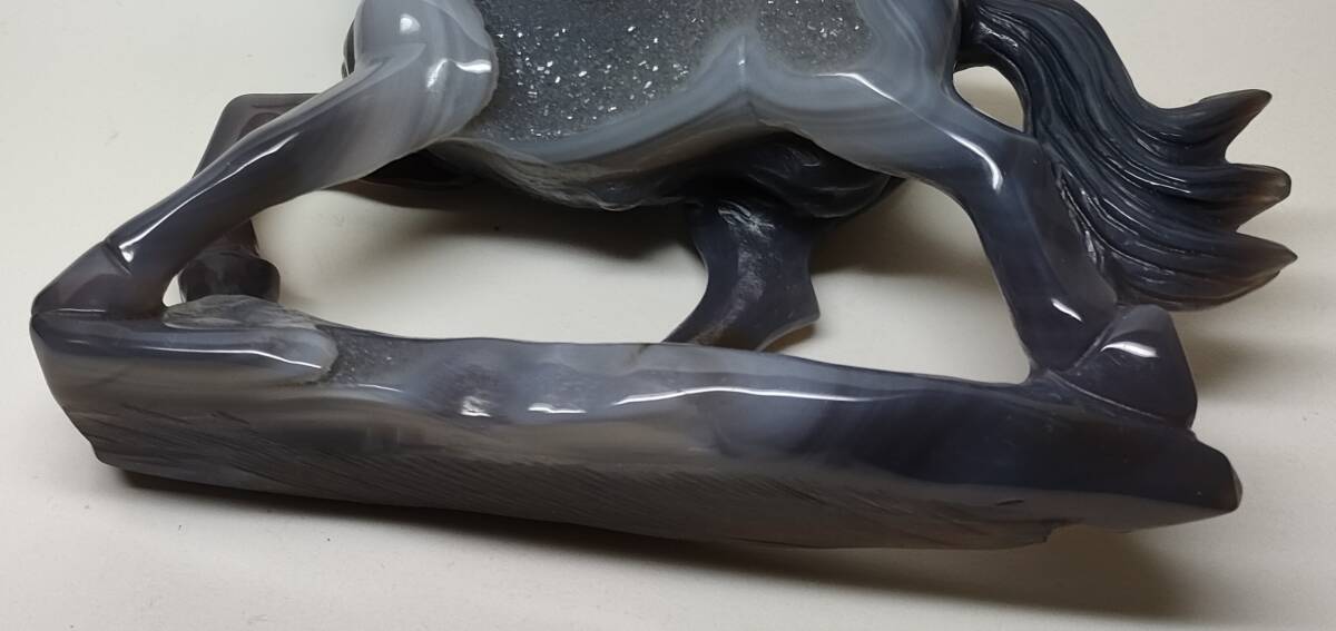 馬の胴の左側には玉髄の結晶がそのまま残っており、キラキラと光を反射します。