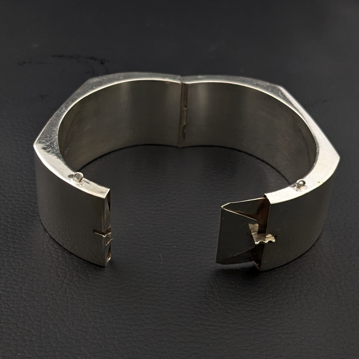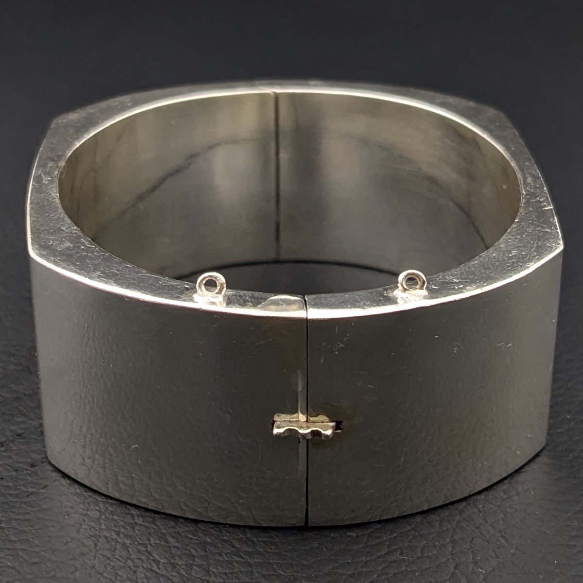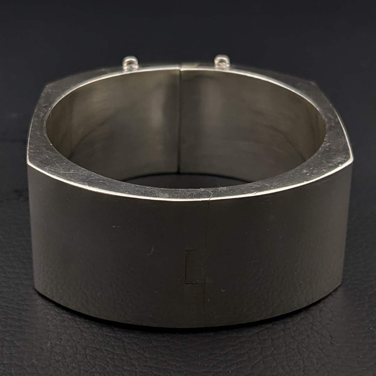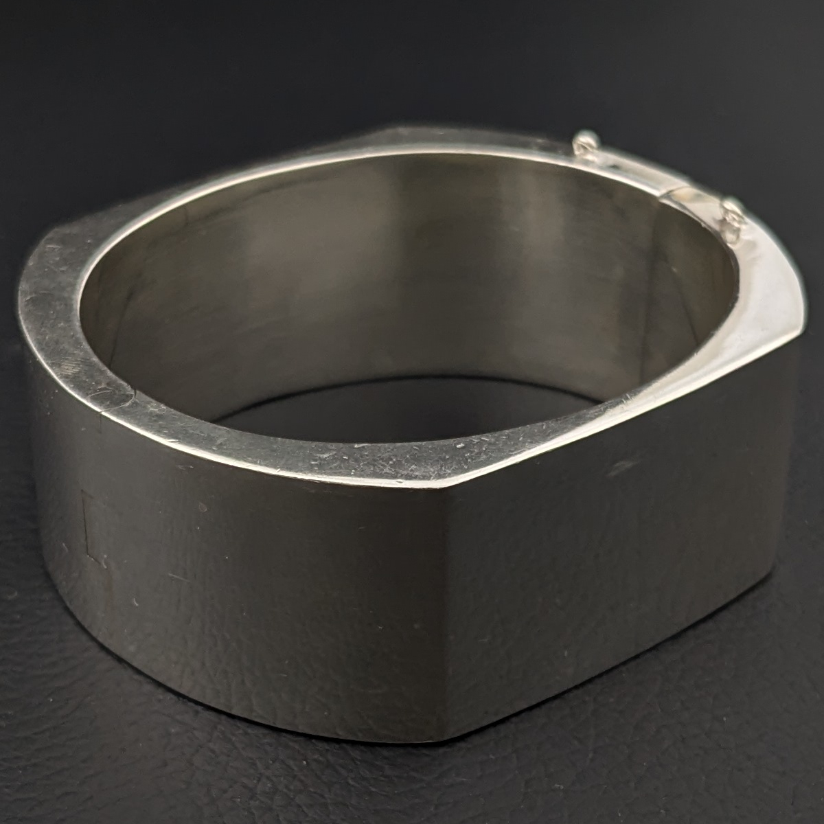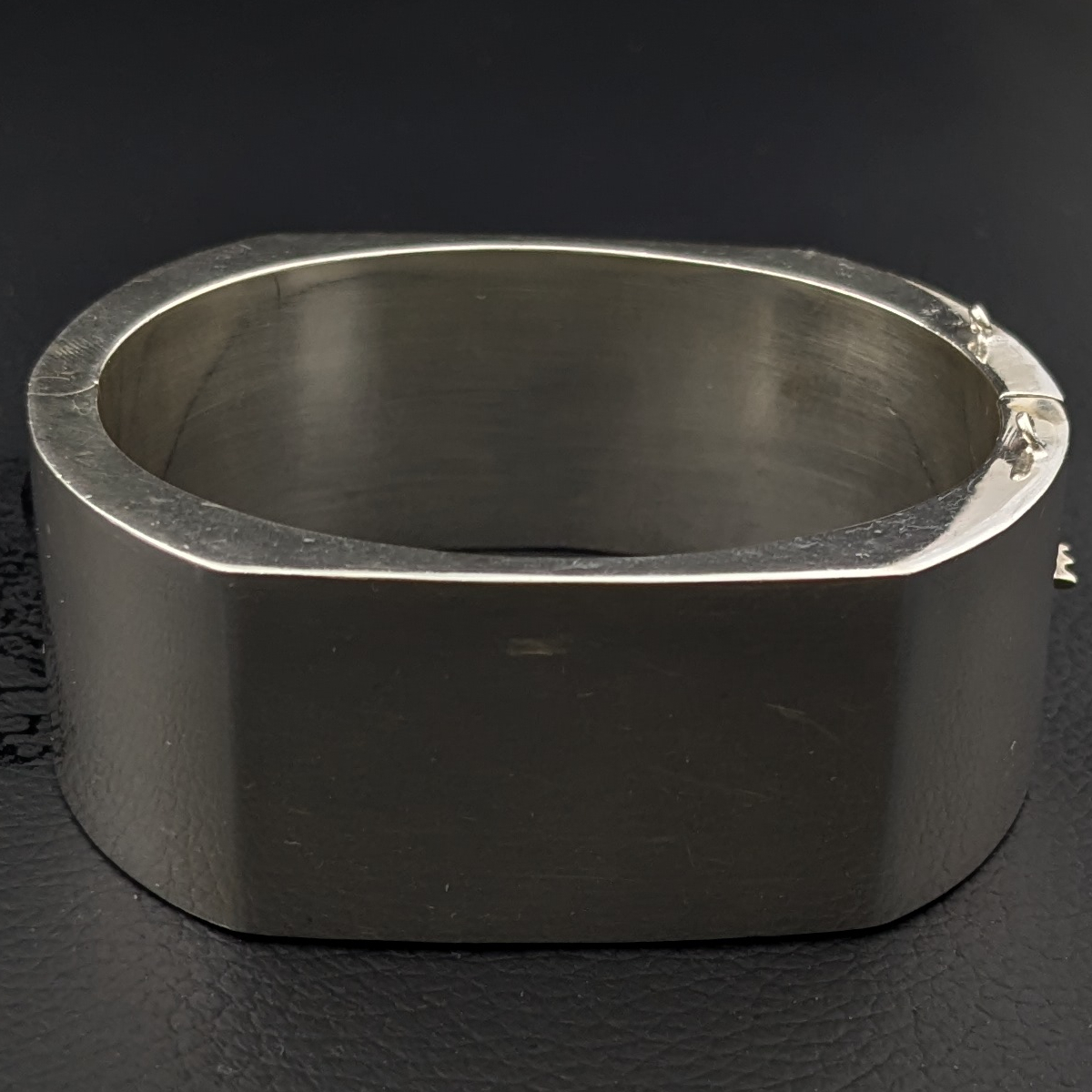 | 商品説明 | 素材:シルバー925 (スターリングシルバー) 産地: 年代: 内周約17.4cm、幅約2.4cm、開口部7.3cm、重量約46.5g セーフティチェーンは欠損しています。 出品前に検品をしておりますが、見落としがある可能性もございます。 |