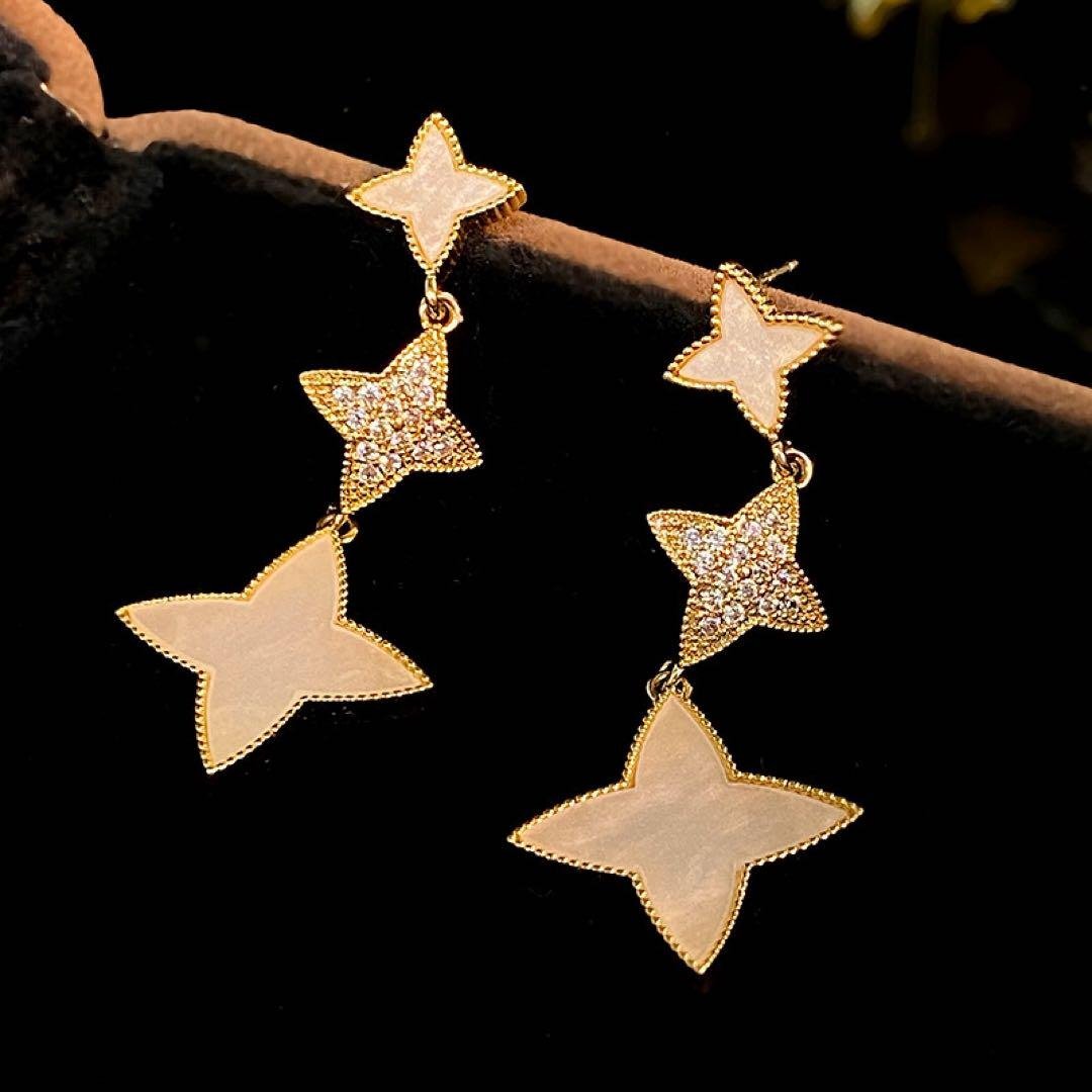 金色の三連星形ダングルピアス,カジュアルな服装から、フォーマルな服装までさまざまなコーディネートに合わせられます。