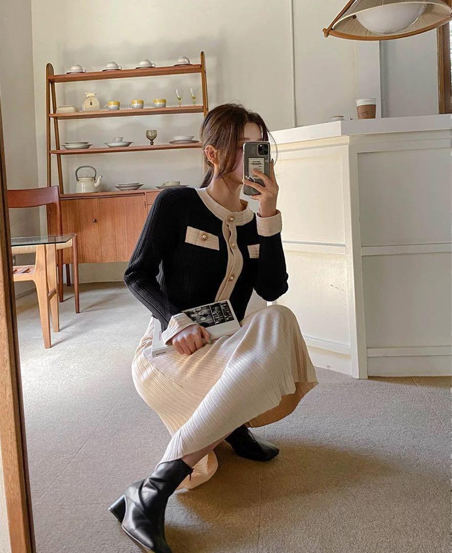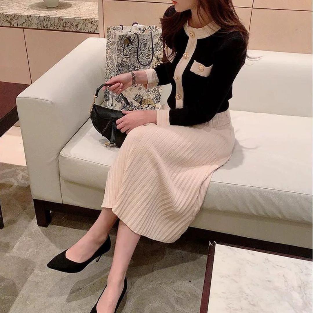 トップスの長袖 ニット セーターと膝下丈のスカート