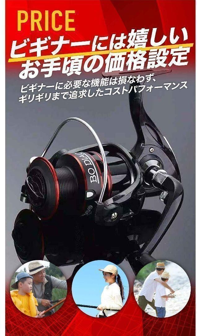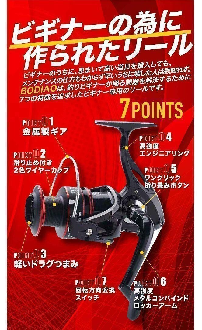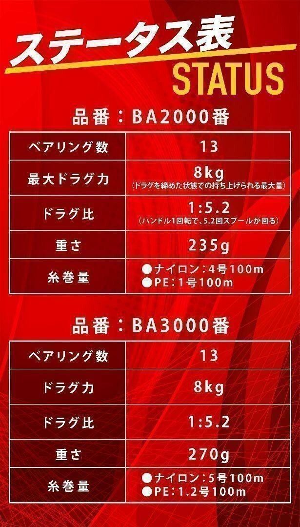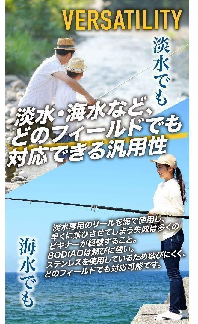 北海道・沖縄・離島への配送は、別途郵送料がかかります。対象の方はコメント欄にコメントをお願いします。 送料無料!(北海道、沖縄、離島への配送を除く) 2000番 3000番をご用意しております。 ※ステータスは最下部に記載しております。 ◆初心者専用 初心者のうちに、息まいて高い道具を購入しても、メンテナンスの仕方もわからず早いうちに壊した人は数知れず。 BODIAOは、釣りビギナーが陥る問題を解決するために6つの特徴を追求したビギナー専用のリールです。 ◆価格設定 初心者に必要な機能は損なわず、ギリギリまで追求した価格パフォーマンス ◆軽さ BODIAOは、同じ価格帯の中でもトップクラスの軽さを誇ります。長時間の釣行でも疲れさせません 大手シマノやダイワの8000円~9000円格帯商品と比較しても負けない軽さを誇ります! ◆デザイン 見出し:数多のロッドとマッチするクールなデザイン 釣具の格好良さは誰しも追及するもの。BODIAOは、クールな2色のデザインに仕上げているので、どのロッドと合わせても完成された一体感をだします。 ◆汎用性 淡水専用のリールを海で使い、早くに錆びさせてしまう失敗は多くの初心者が経験すること。 BODIAOは、錆びに強いステンレスを使用しているため、錆びにくく、どのフィールドでも使用可能です。 ◆耐久度 ジャンク品を購入ではなく、新品を購入してメンテナンス方法を学ぶことも! 水に触れる部分は錆びにくい素材を、破損しやすい内部には摩耗しにくい銅、亜鉛合金を使用しているため丈夫で長期間ご使用いただけます。 BA2000番 ベアリング数 13 最大ドラグ力:8kg(ドラグを締めた状態での持ち上げられる最大量) ドラグ比:1:5.2(ハンドル1回転で、5.2回スプールが回る) 重さ:235g 糸巻量(ナイロン):4号100m (PE):1号100m BA3000番 ベアリング数:13 ドラグ力:8kg ドラグ比:1:5.2 重さ:270g 糸巻量(ナイロン):5号100m (PE):1.2号100m