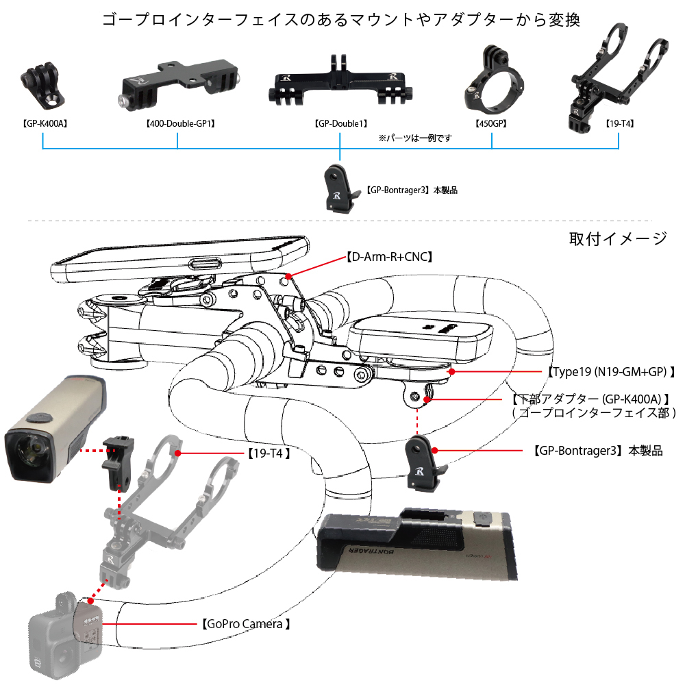 レックマウント製 コンボマウントに付属する下部アダプター【GP-K400A】や ダブル用ベースアダプター 【400-Double-GP3】など ゴープロインターフェイスのあるパーツに対応