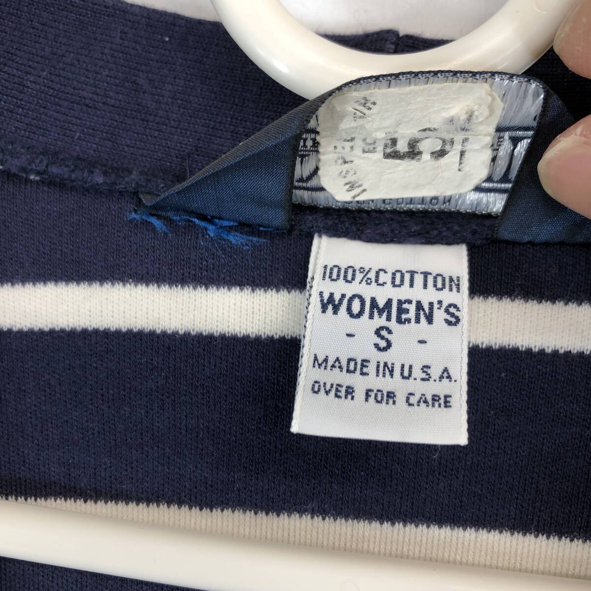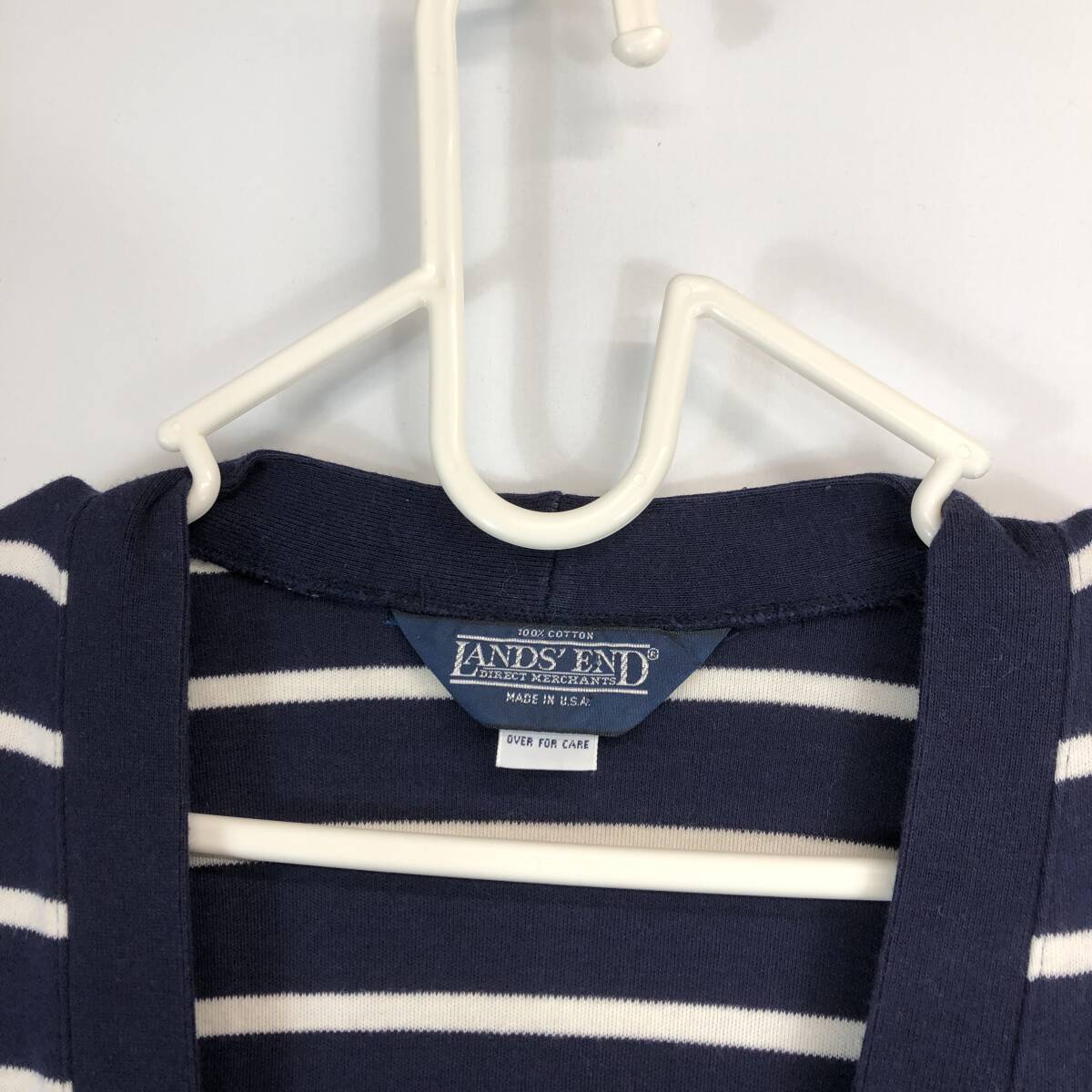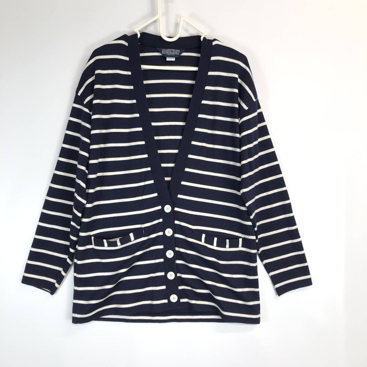 90s USA製 ランズエンド(LAND'S END)  コットンカーディガン ボーダー ネイビー ホワイト レディースSサイズの出品です。