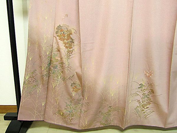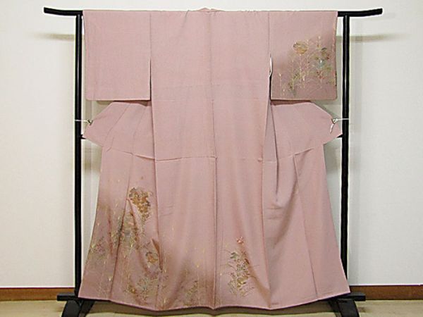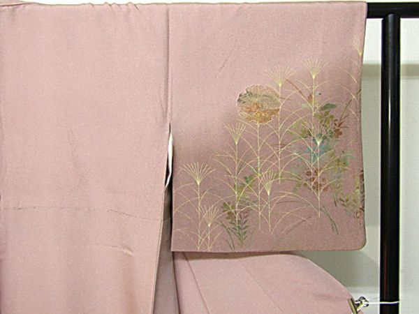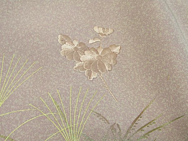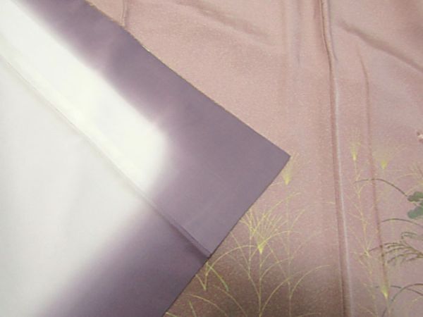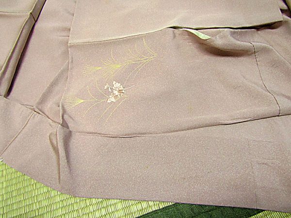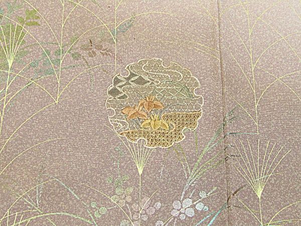 藤色地、刺繍と金彩加工の附下きものです。