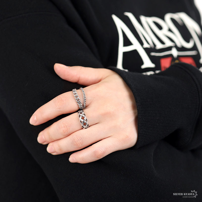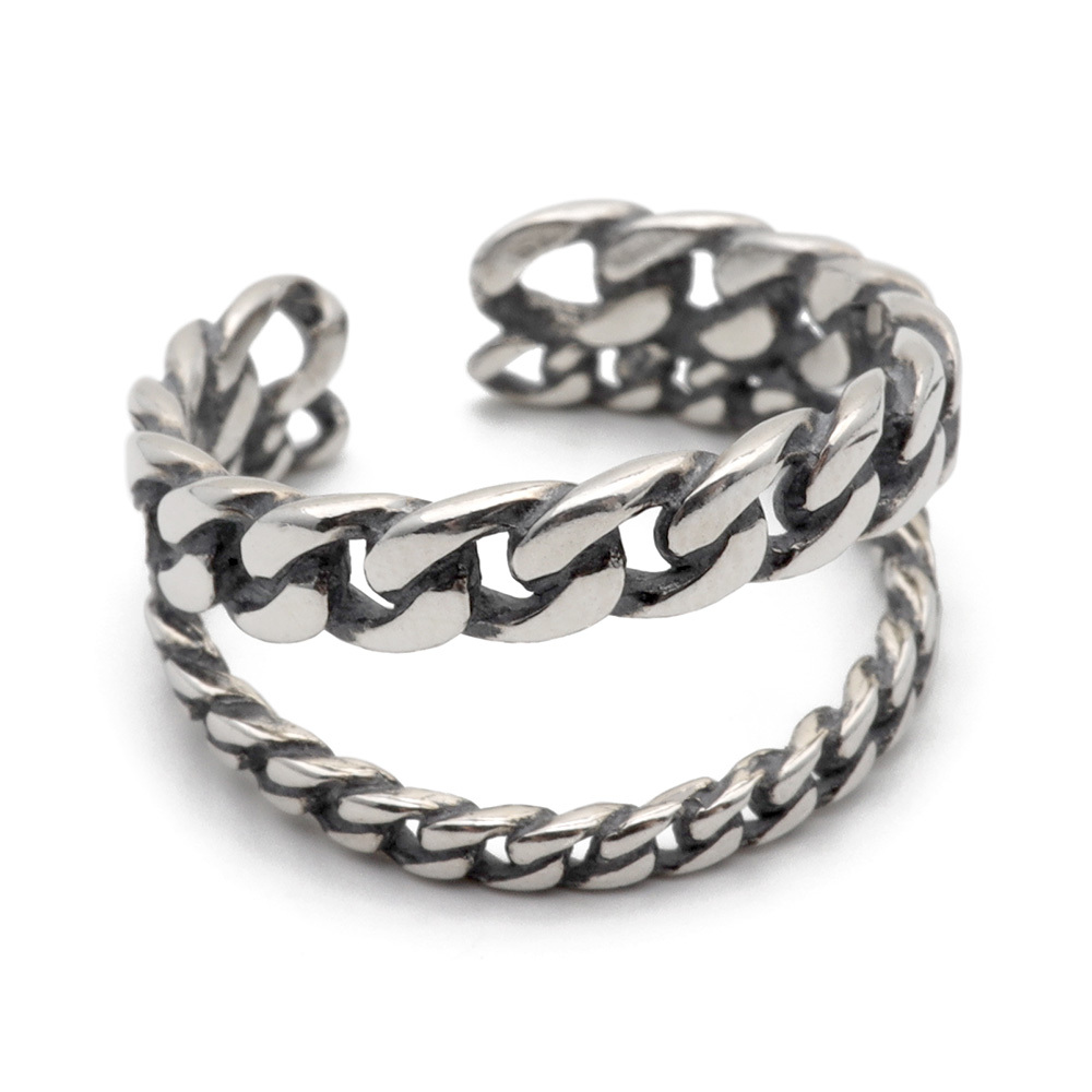 太さの異なる喜平チェーンをモチーフにしたリング。二連風デザインがアクセントになって、お洒落な雰囲気を作ってくれるアイテム。