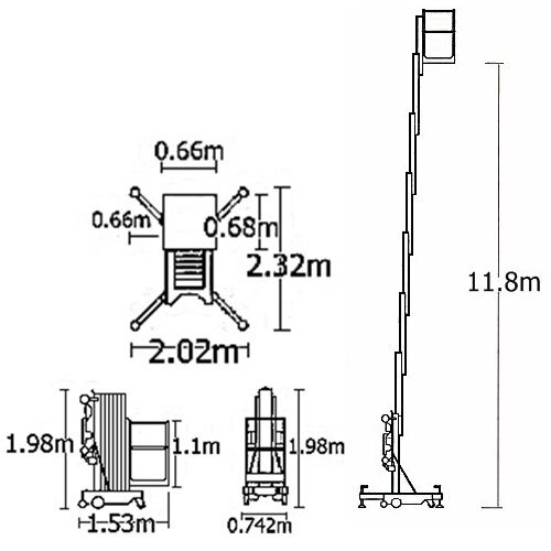商品名・型式 | 最大作業高 (m) | 最大床高 (m) | 最大積載荷重 (kg) | 作業床寸法(mm) | 保管時寸法(mm) | 重量 (kg) | 動力 | |||