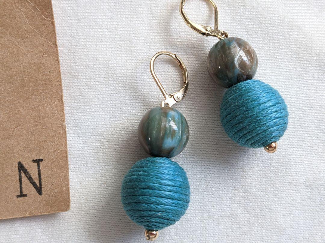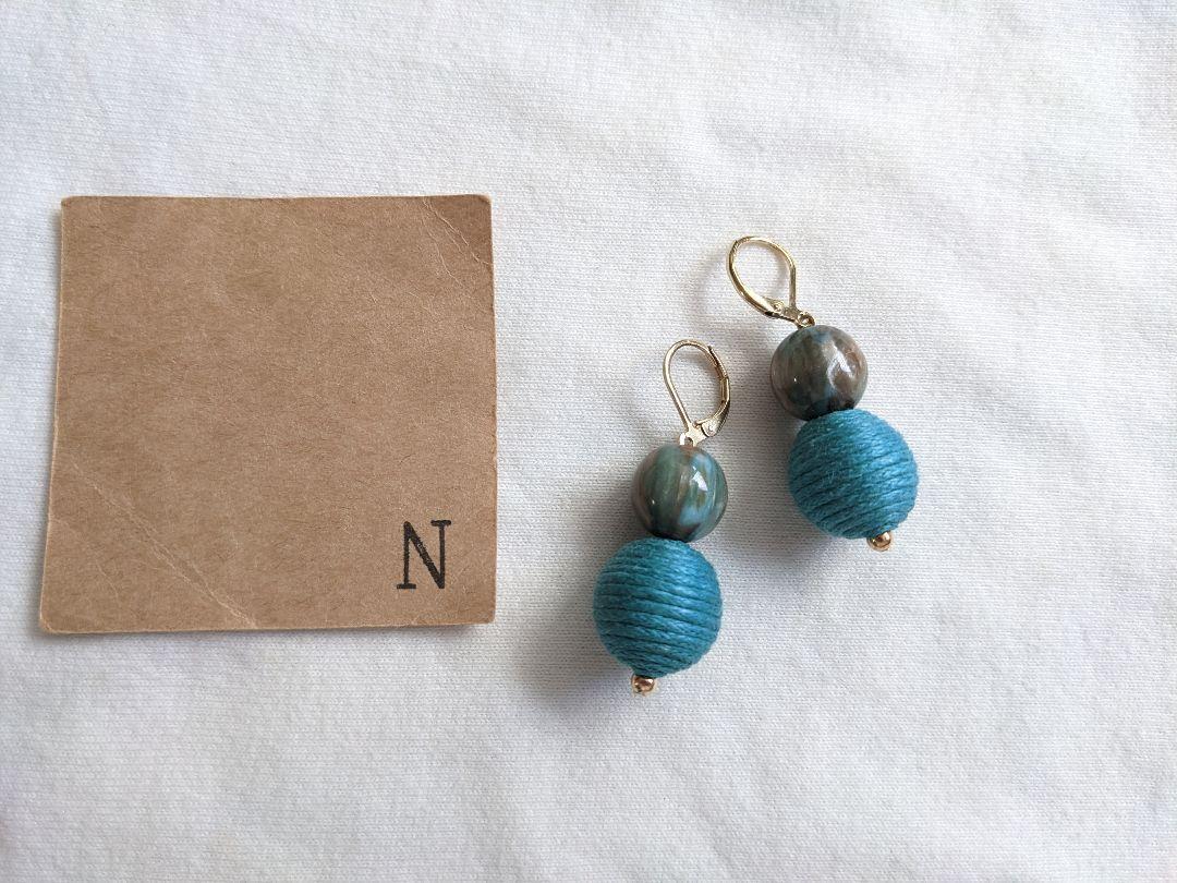 糸巻きビーズとターコイズカラーマーブルビーズを使いましたピアスです。ブルーがこれからの季節にピッタリです。デニムやフレアパンツ、Tシャツなどにも。