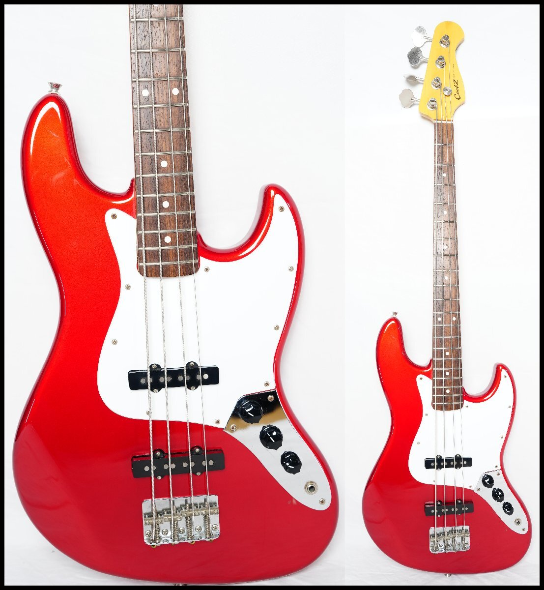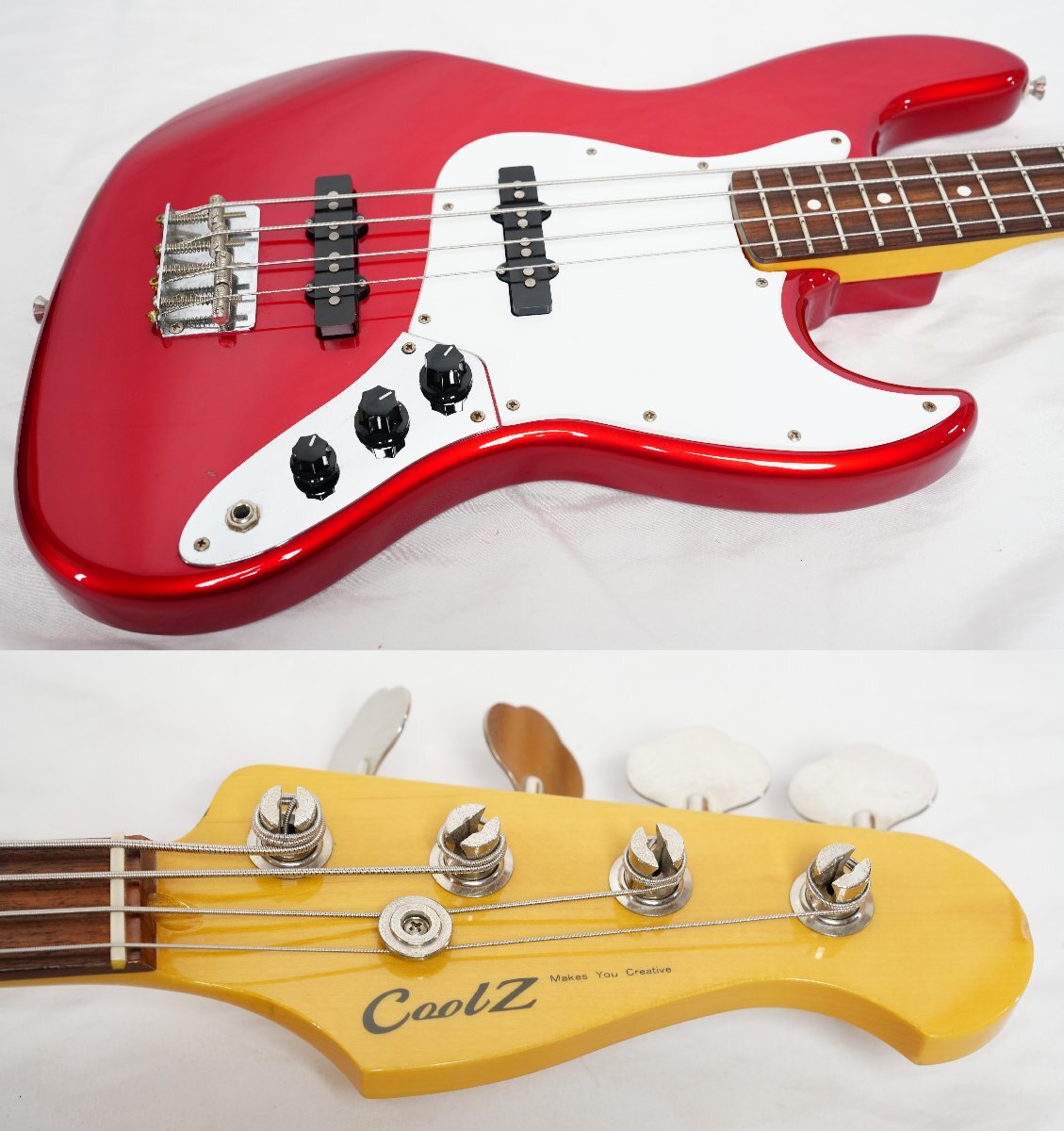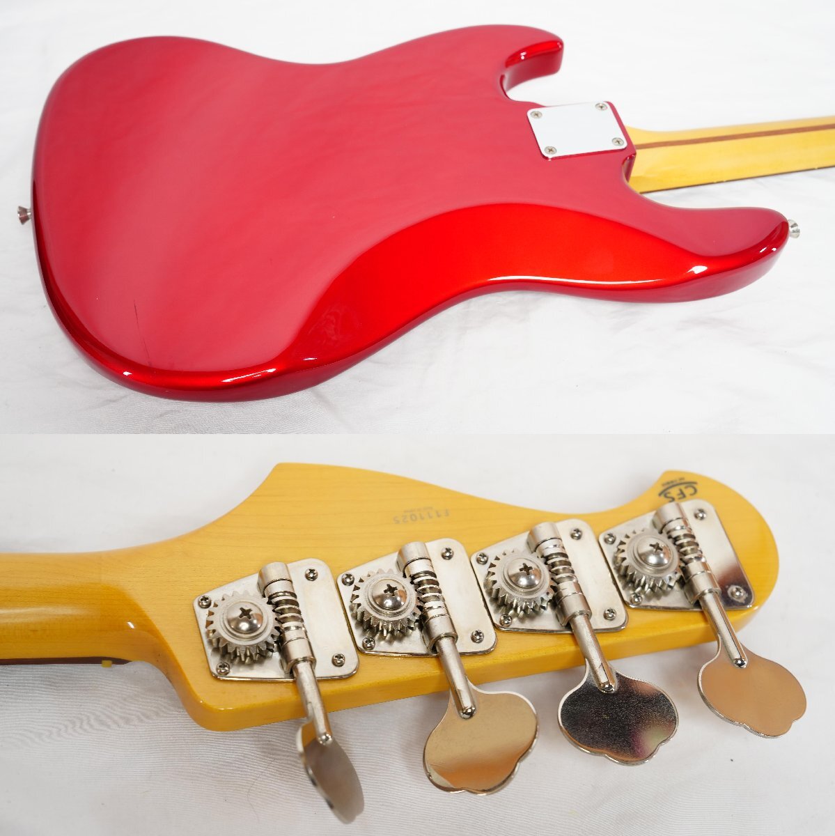 フジゲンが製造を行っている島村楽器オリジナルブランドCool Zのジャズベース ZJB-1R CAR(オープンプライス、市場価格¥71064(税込))です。製造は国内屈指のギター製造メーカーフジゲンによるもので品質は間違いない丁寧な作りです。 低域のクリアーでナチュラルな高品質なサウンドでジャズ、ロックまで幅広いジャンルで使用出来るスタンダードなジャズベースです。サークル・フレッティング・システム(C.F.S.)を採用しているためピッチの安定した抜けの良いサウンドです。 ブランドネームバリューが気にならなければコストパフォーマンスの高い1本だと思います。 ■■■以下わかる範囲でのスペックです。■■■ ボディ材 : Alder MAPLE 指板 : Rosewood ピックアップ : オリジナル LOUIS JBピックアップ 重量 :約4.2kg ナット幅 : 約38.9mm シリアルナンバー : MADE IN JAPAN F1110×× カラー : CAR (Candy Apple Red) フレットは主観ですが約8~9部山程度残量があります。 ■商品の状態■ *数カ所傷、擦れ程度で使用感は少なくコンディション良好です。 *ネックはほぼフラットで反りは感じられません。 *動作確認済みです。 ■付属品■ 社外ソフトケース | ||