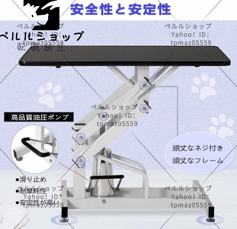 ●水圧システムにより、テーブルはペットの高さを上げるので、入浴、トリミング、乾燥、グルーミング、その他のペットケアのために簡単に手が届きます。