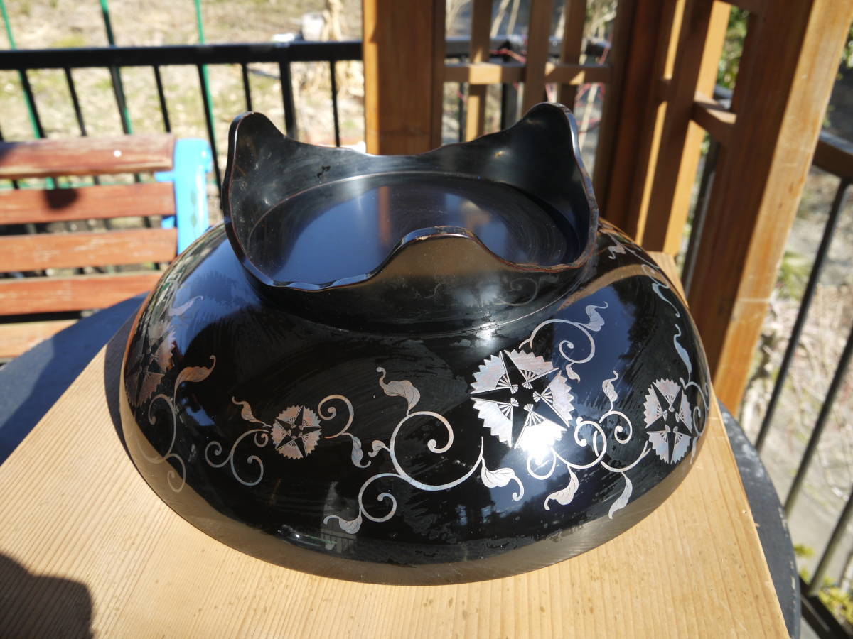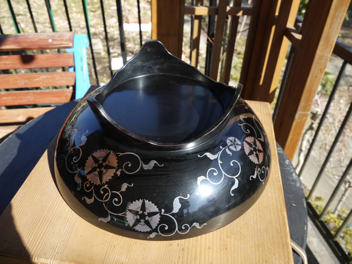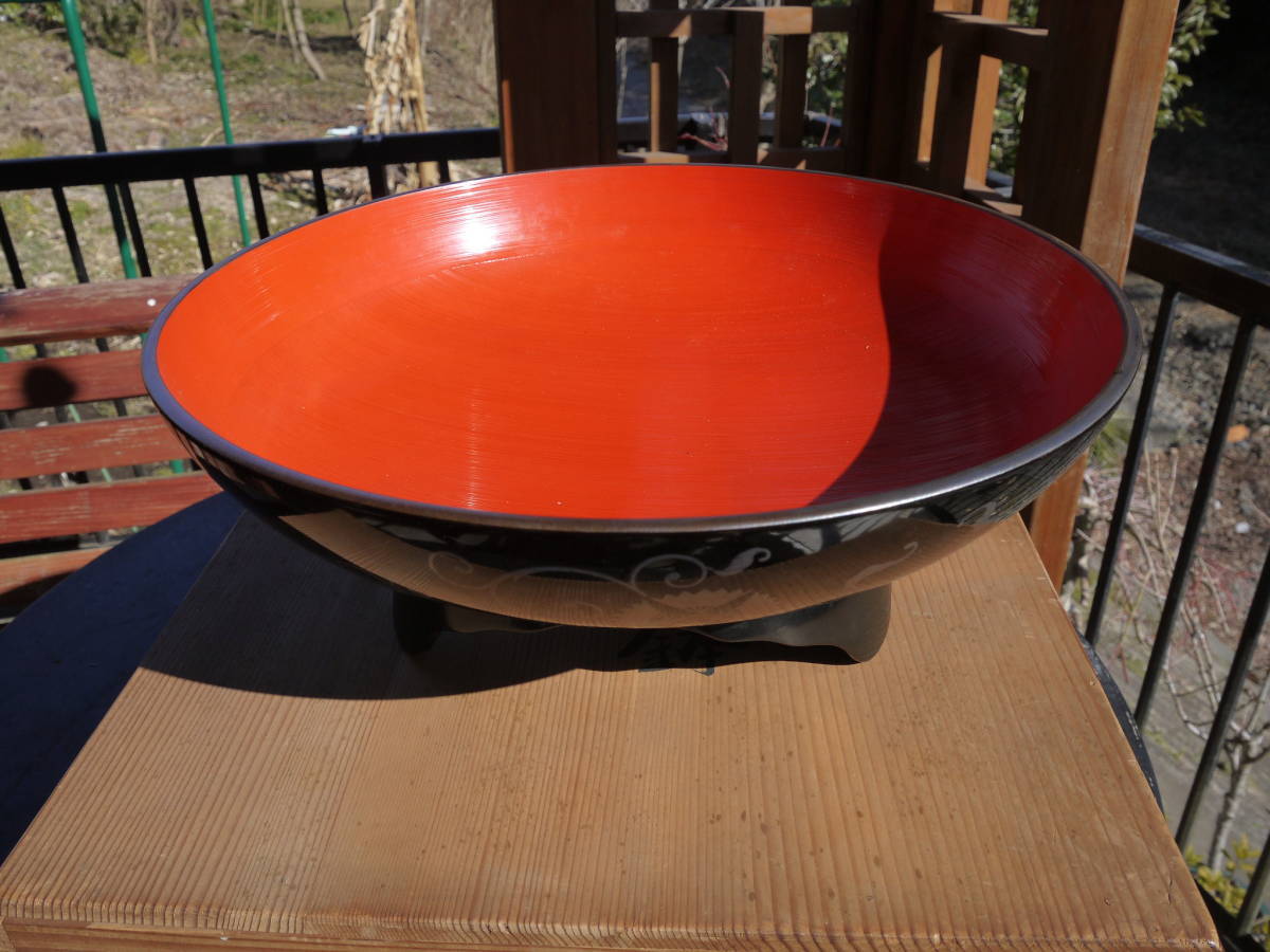 ★【A30214】御紋唐草銀蒔絵 黒内洗朱 木鉢 菓子鉢 菓子器 内朱塗り 「直径36.5x高さ13.5cm」箸付き 時代 元箱