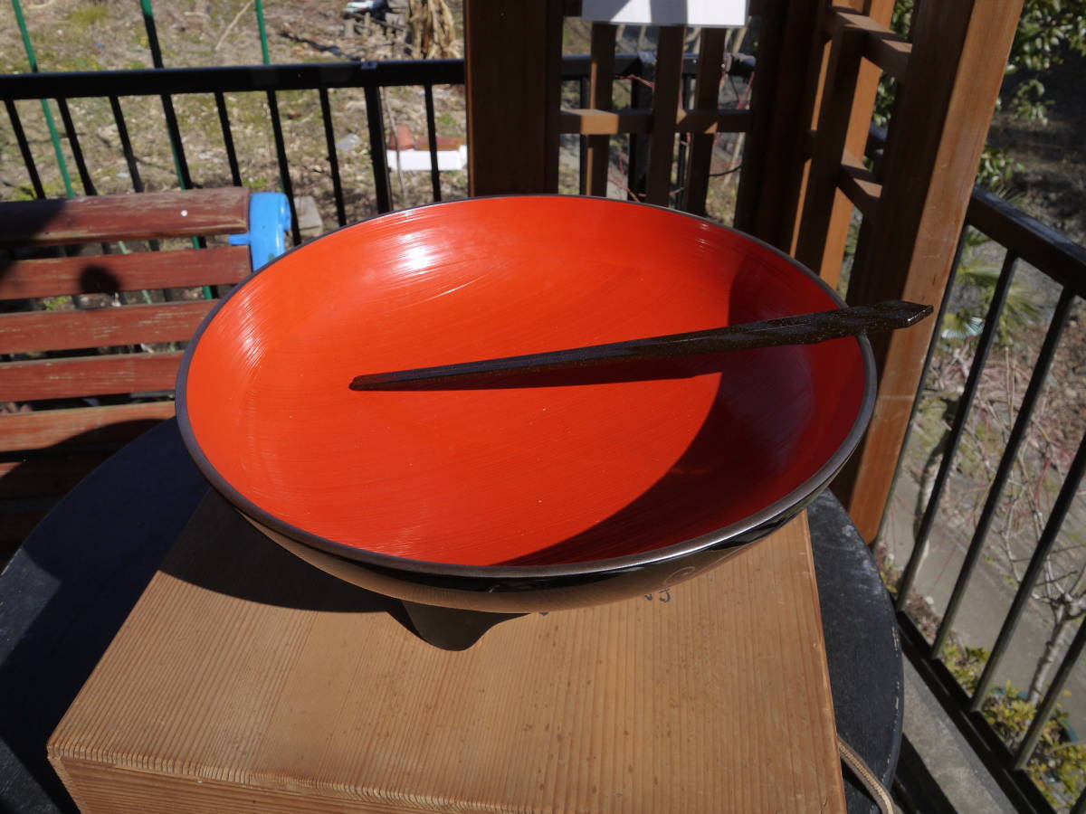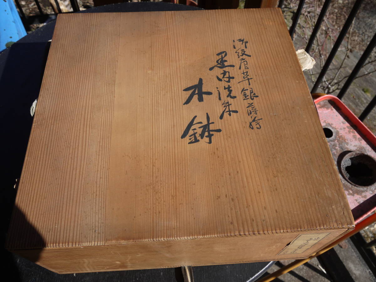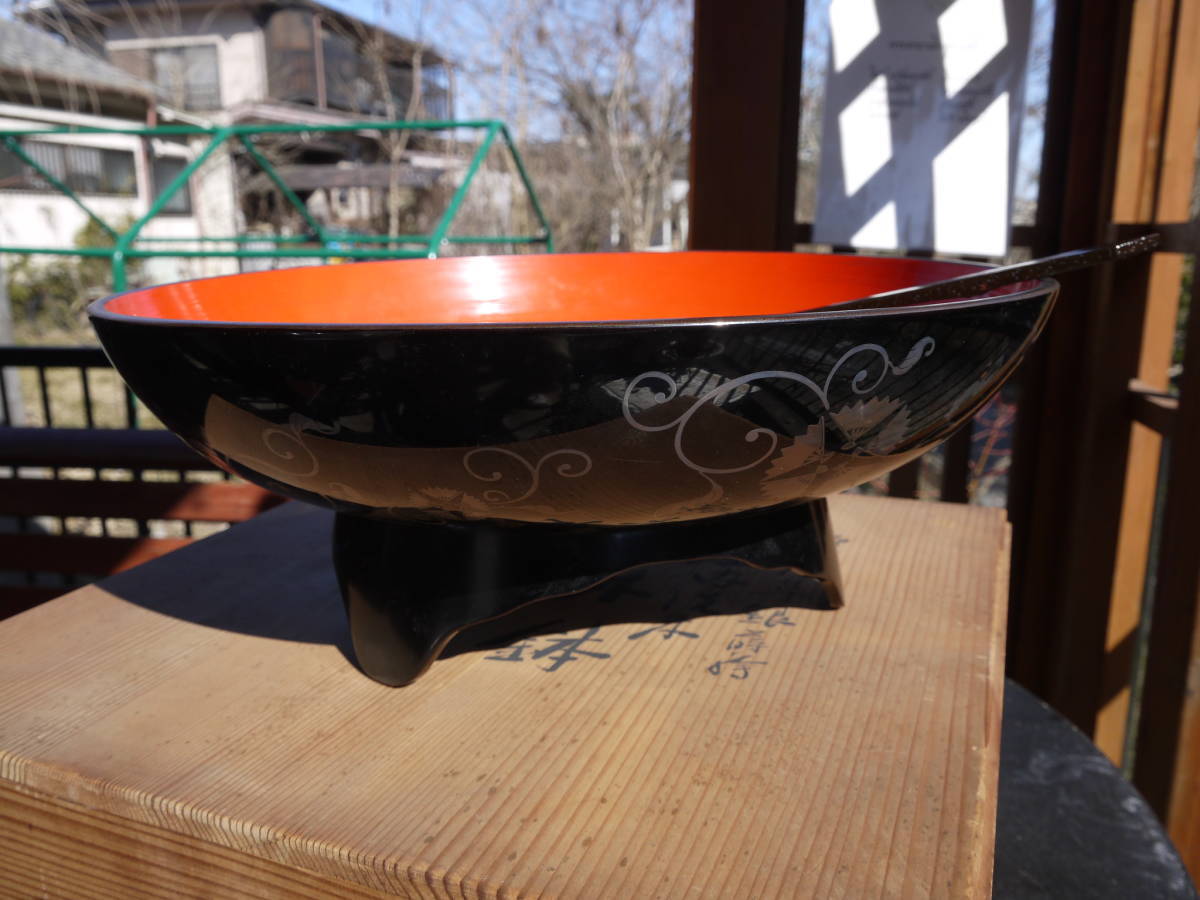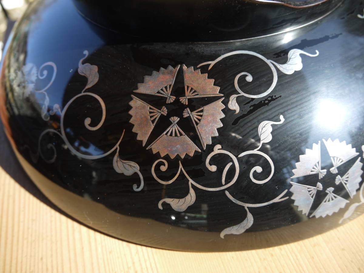 ★【A30214】御紋唐草銀蒔絵 黒内洗朱 木鉢 菓子鉢 菓子器 内朱塗り 「直径36.5x高さ13.5cm」箸付き 時代 元箱