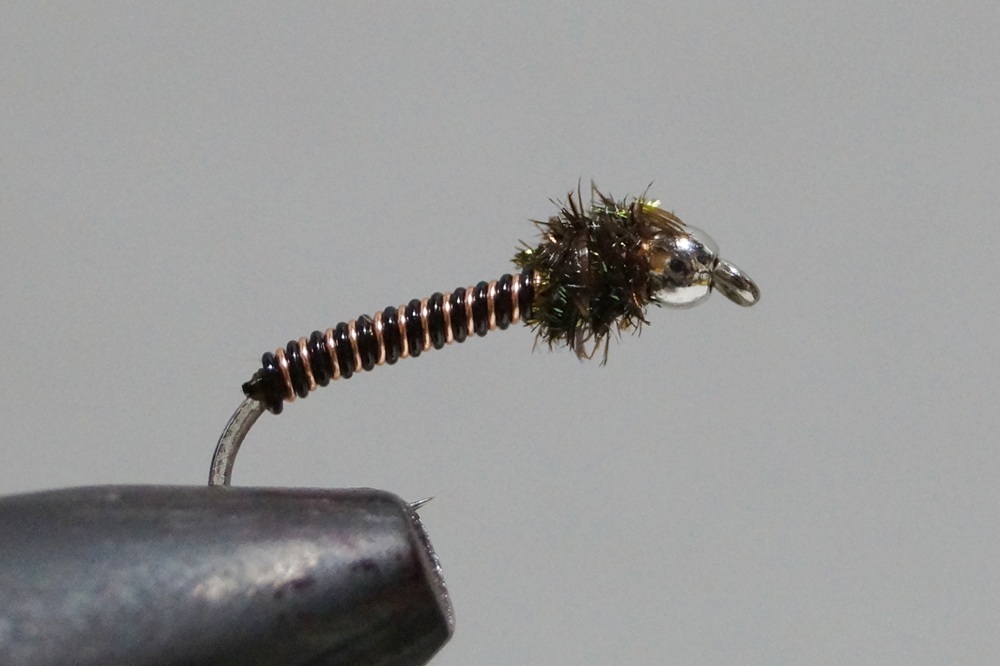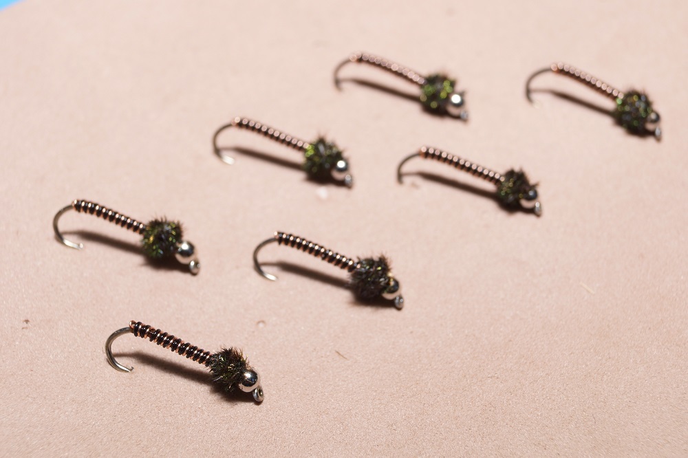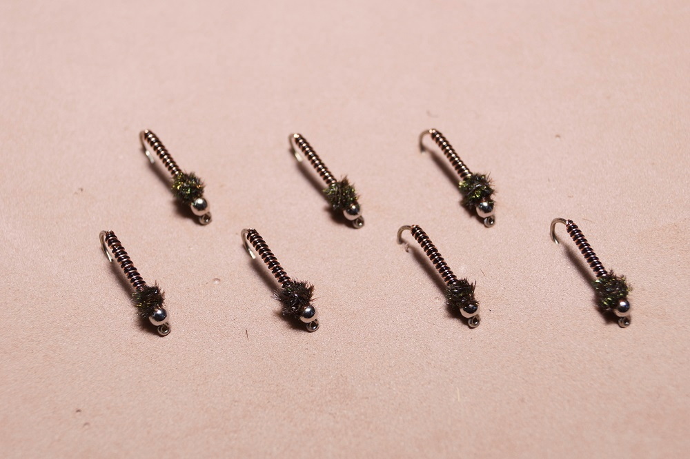 ポリウレタン銅線と黒線を縞状に巻きあげたブラッシーです。ストリーマーフック#12を使用した7本です。ブラスと黒の縞模様で、腹節と銅線の輝きを際立たせた仕様です。