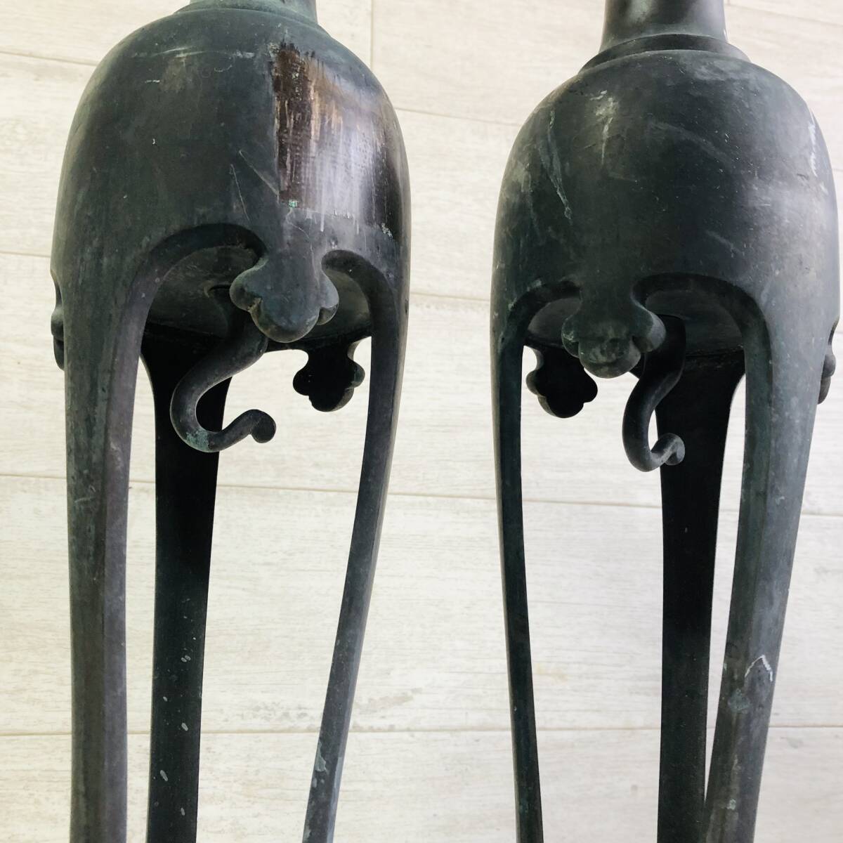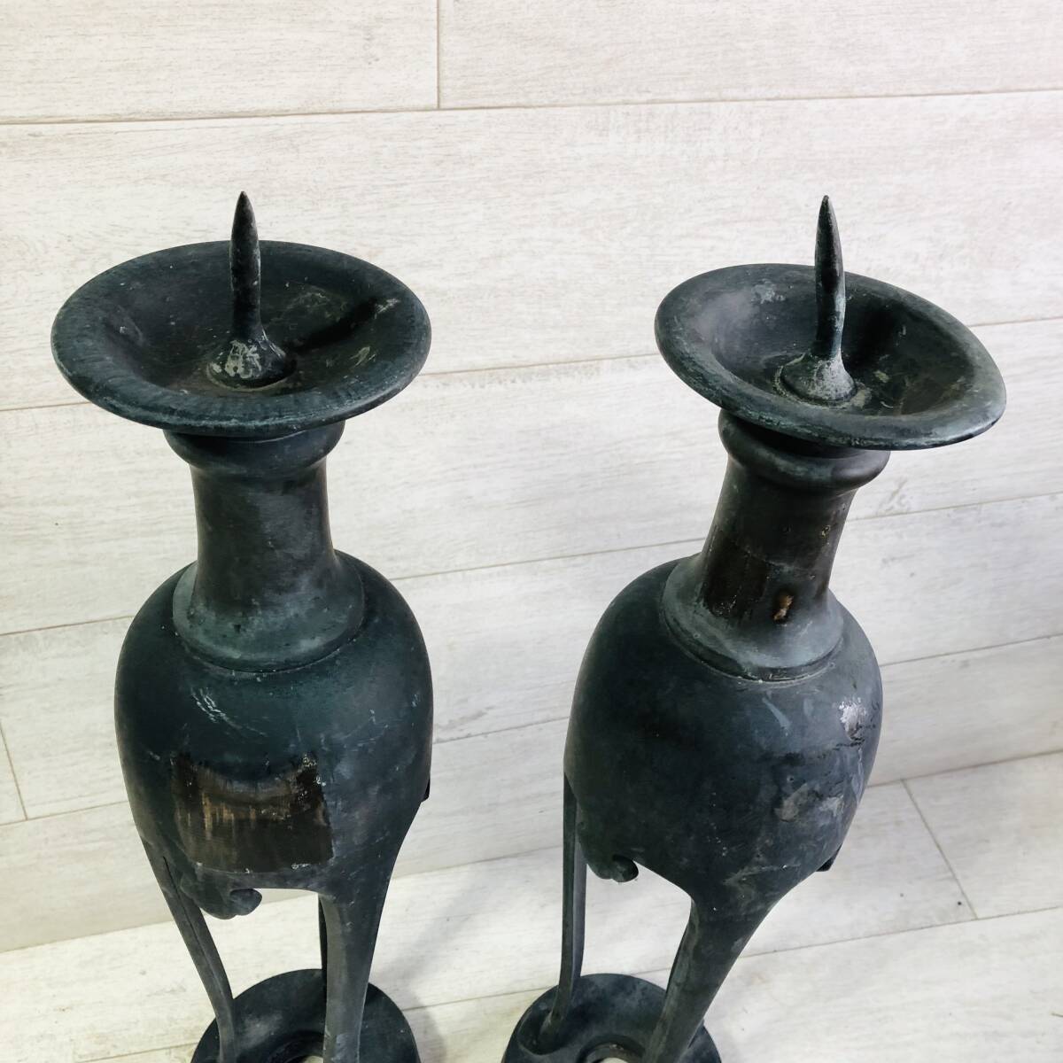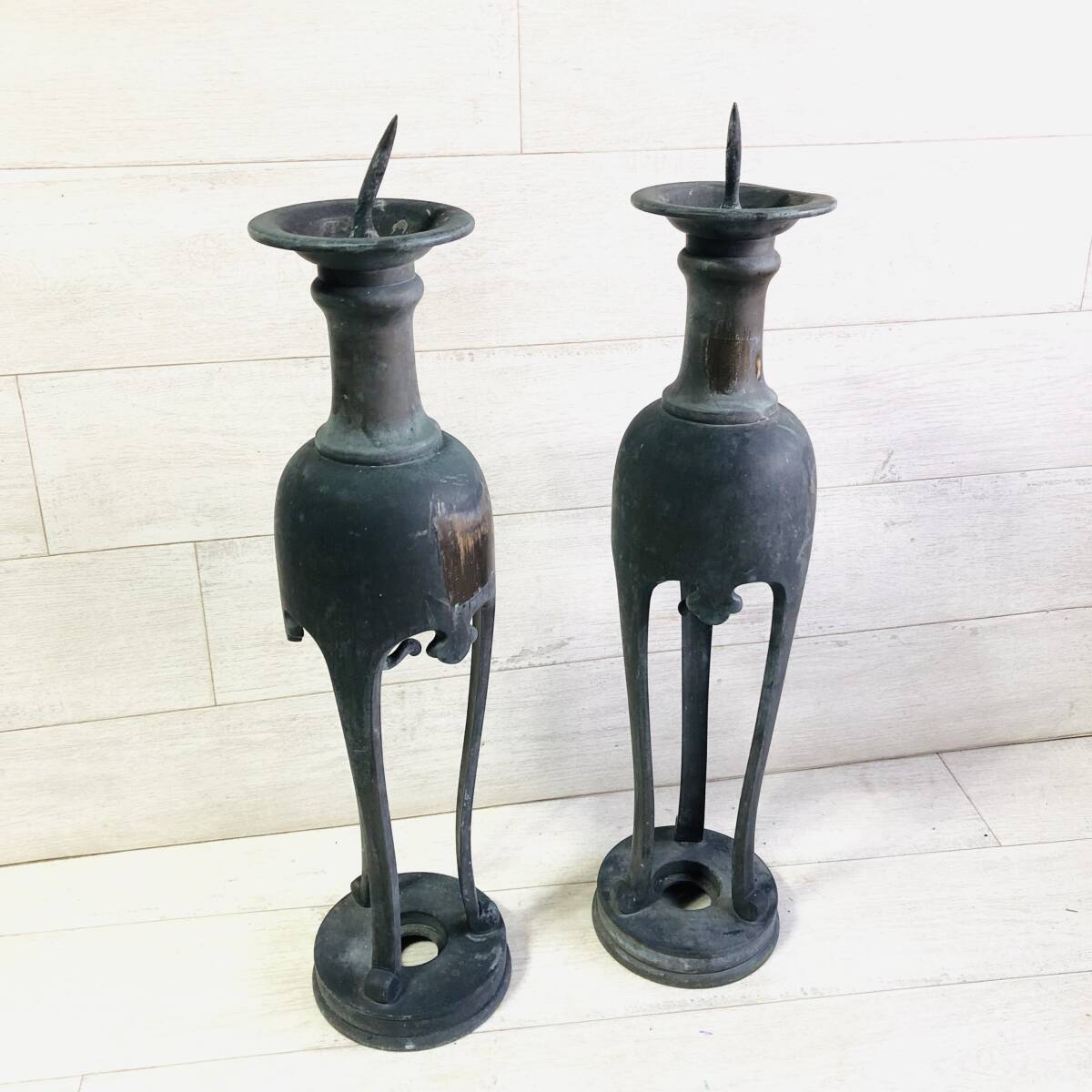 | ▼商品状態 サイズ(約)※素人採寸の為誤差があると思いますがご容赦ください。 高さ50㎝ 底直径12㎝ 重さ3.2㎏ 一対 古青銅製です。 経年保管に伴う汚れ、擦れ、傷、錆等ございます。 状態等写真をご参照ください。 ![]() _______________________________________________________________________ | |
