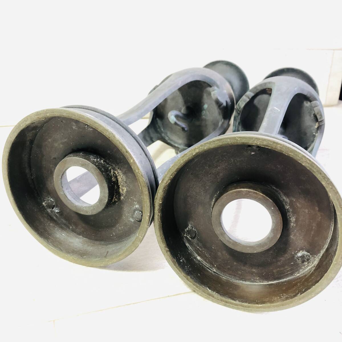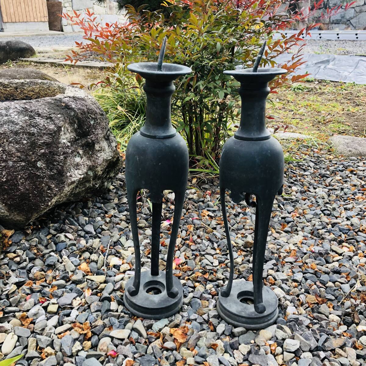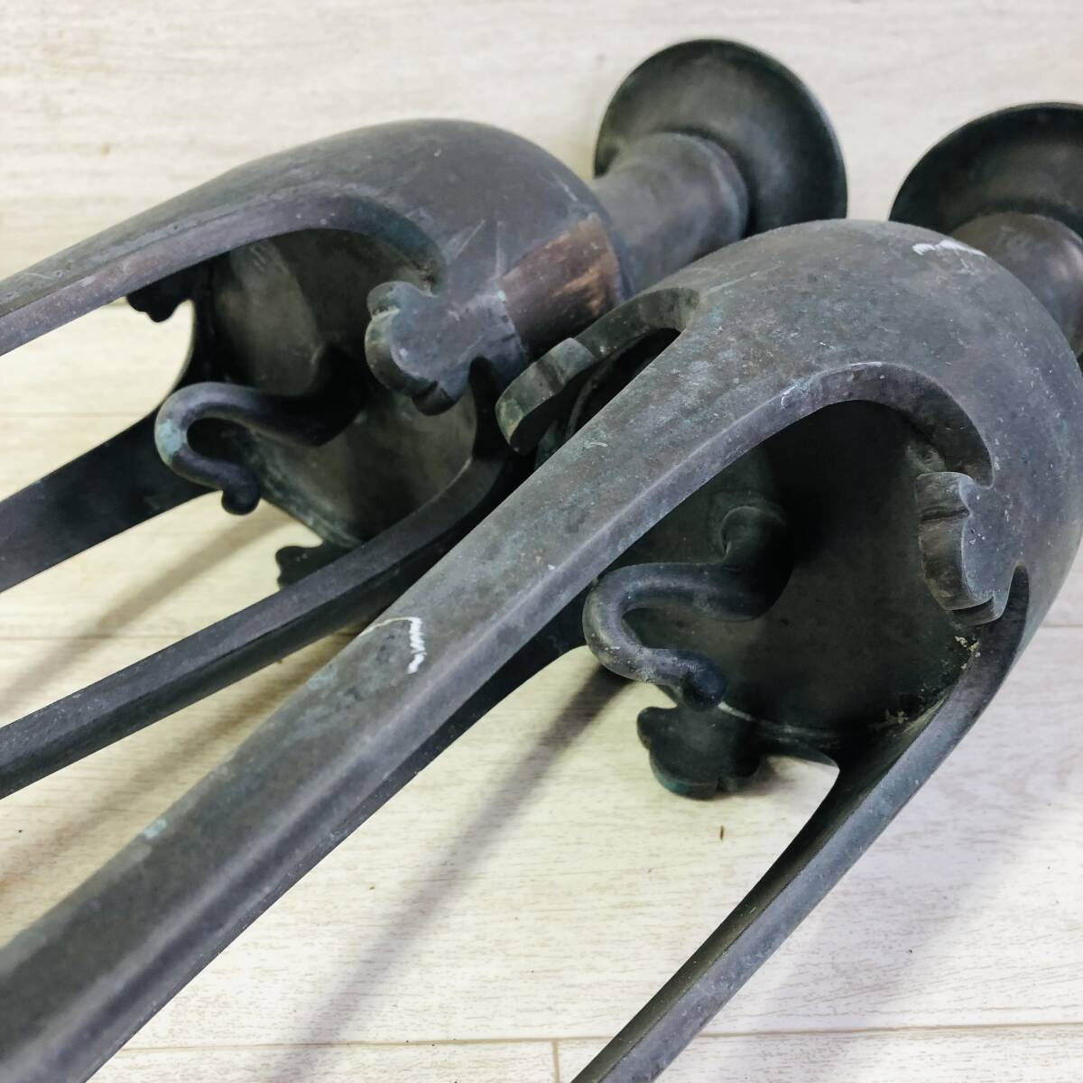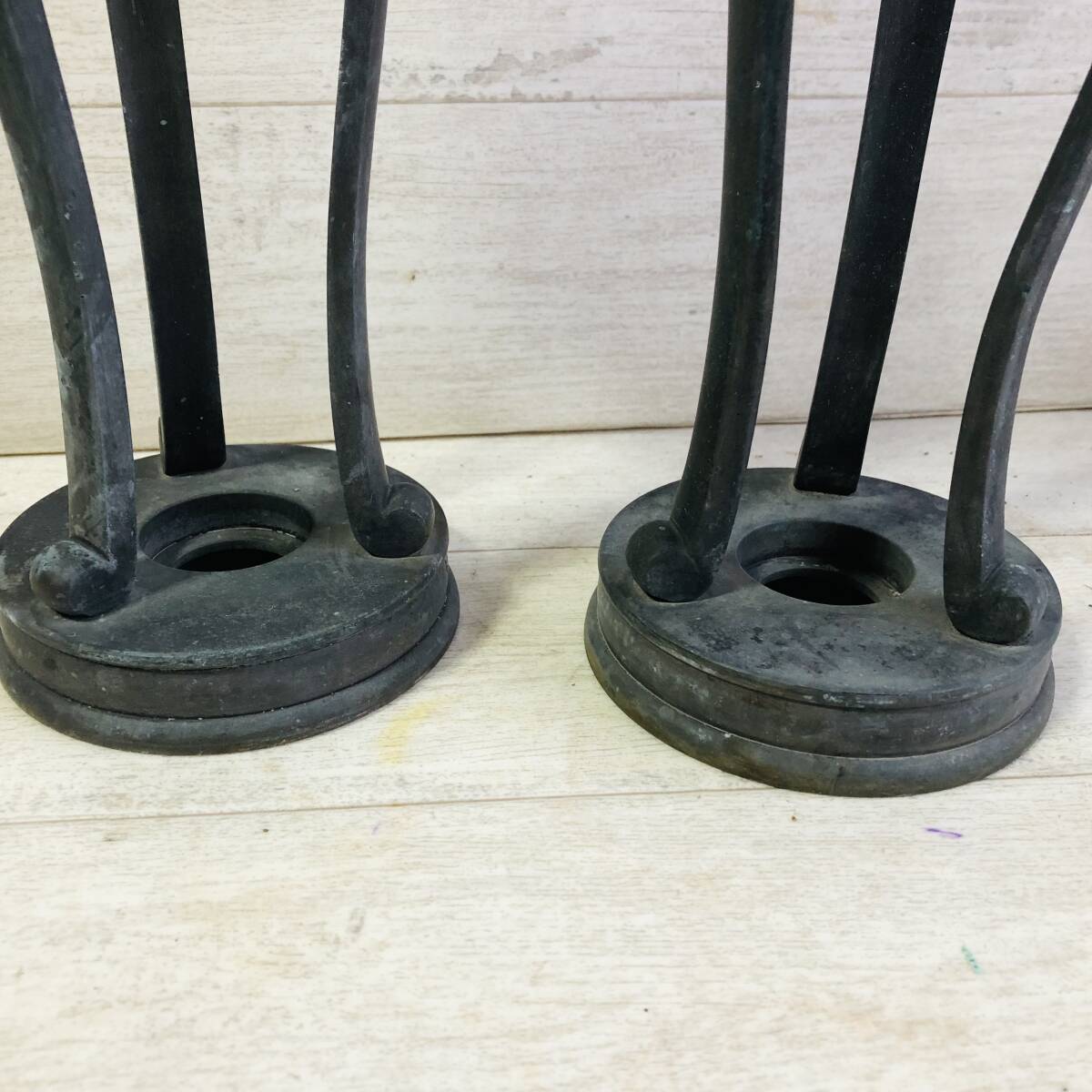 | ▼商品状態 サイズ(約)※素人採寸の為誤差があると思いますがご容赦ください。 高さ50㎝ 底直径12㎝ 重さ3.2㎏ 一対 古青銅製です。 経年保管に伴う汚れ、擦れ、傷、錆等ございます。 状態等写真をご参照ください。 ![]() _______________________________________________________________________ | |