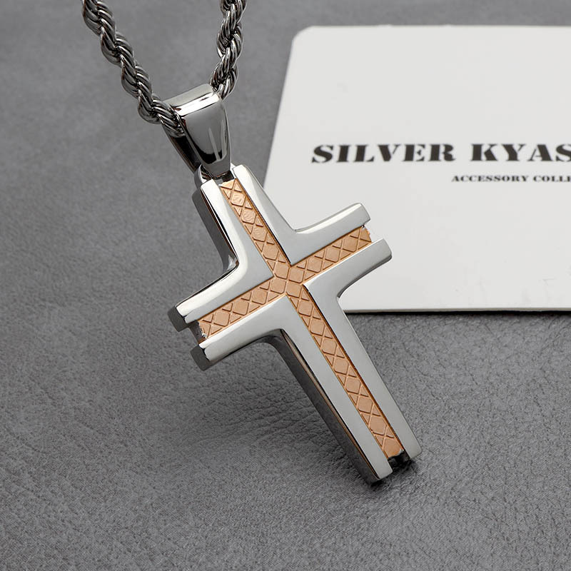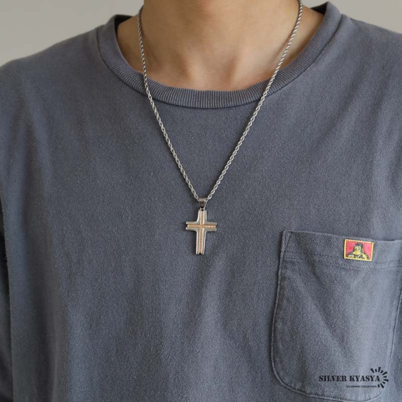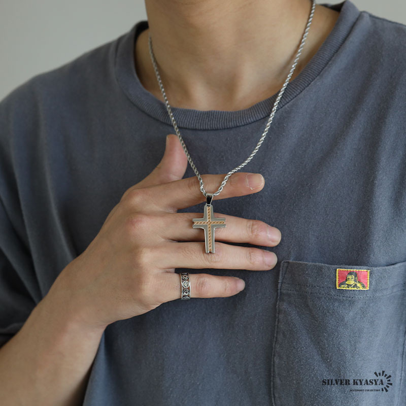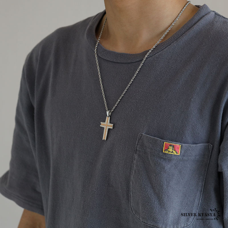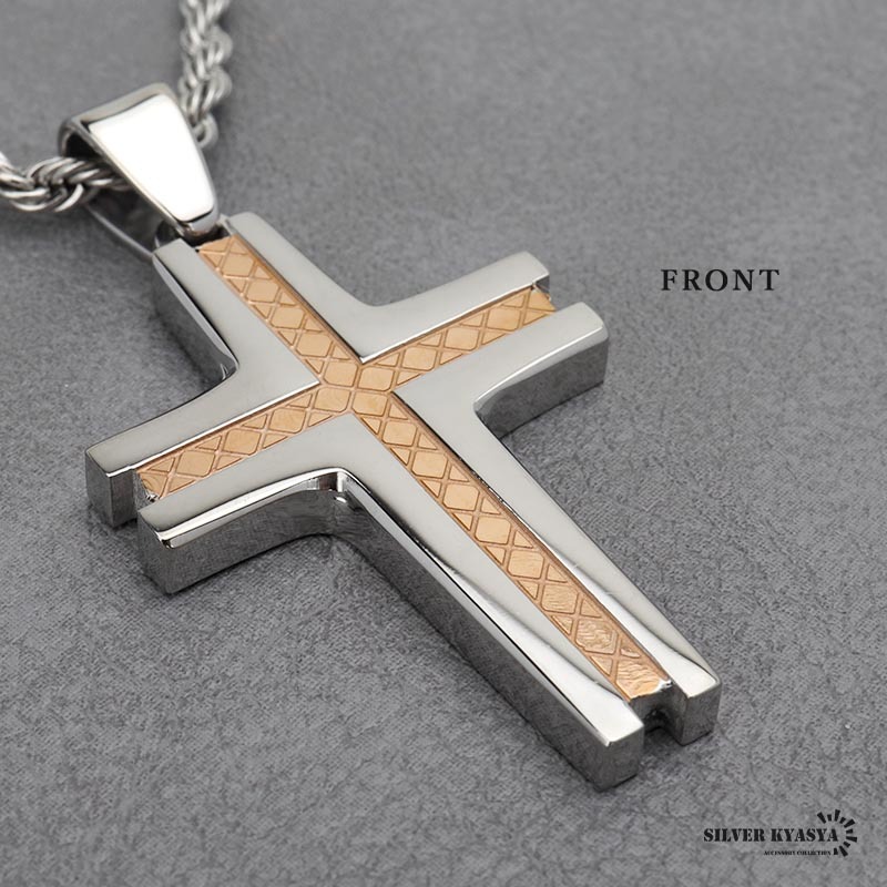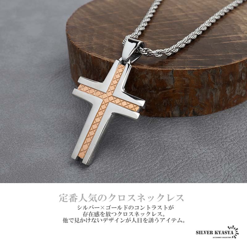 シルバー×ゴールドのコントラストが存在感を放つクロスネックレス。他で見かけないデザインが人目を誘うアイテム。