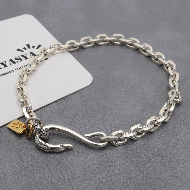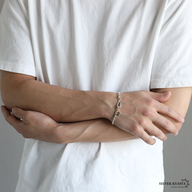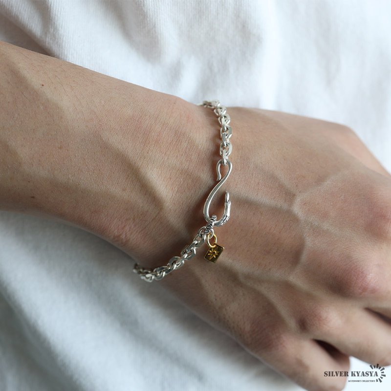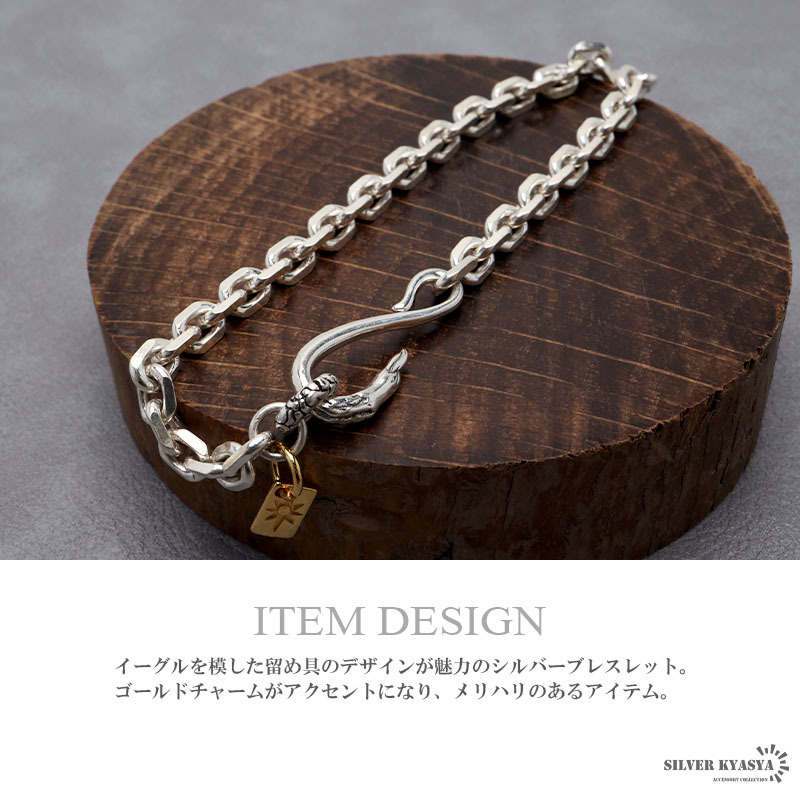 イーグルを模した留め具のデザインが魅力のシルバーブレスレット。ゴールドチャームがアクセントになり、メリハリのあるアイテム。