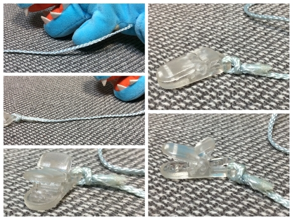 〇クリップとぬいぐるみをつなぐひもや本体の黄色いひもにたわみや折れグセなどがございます。
