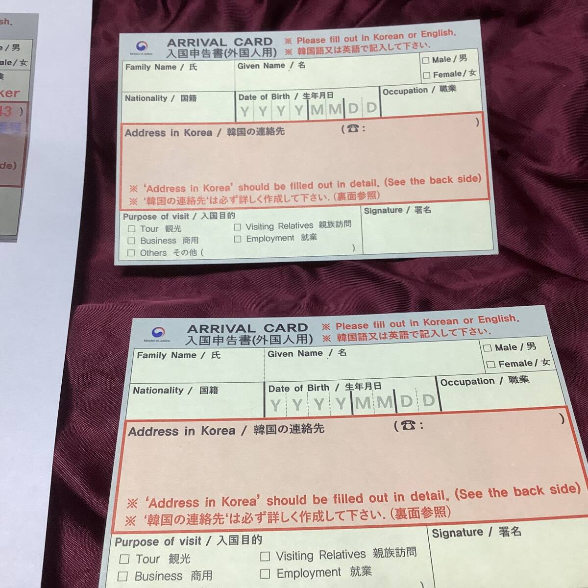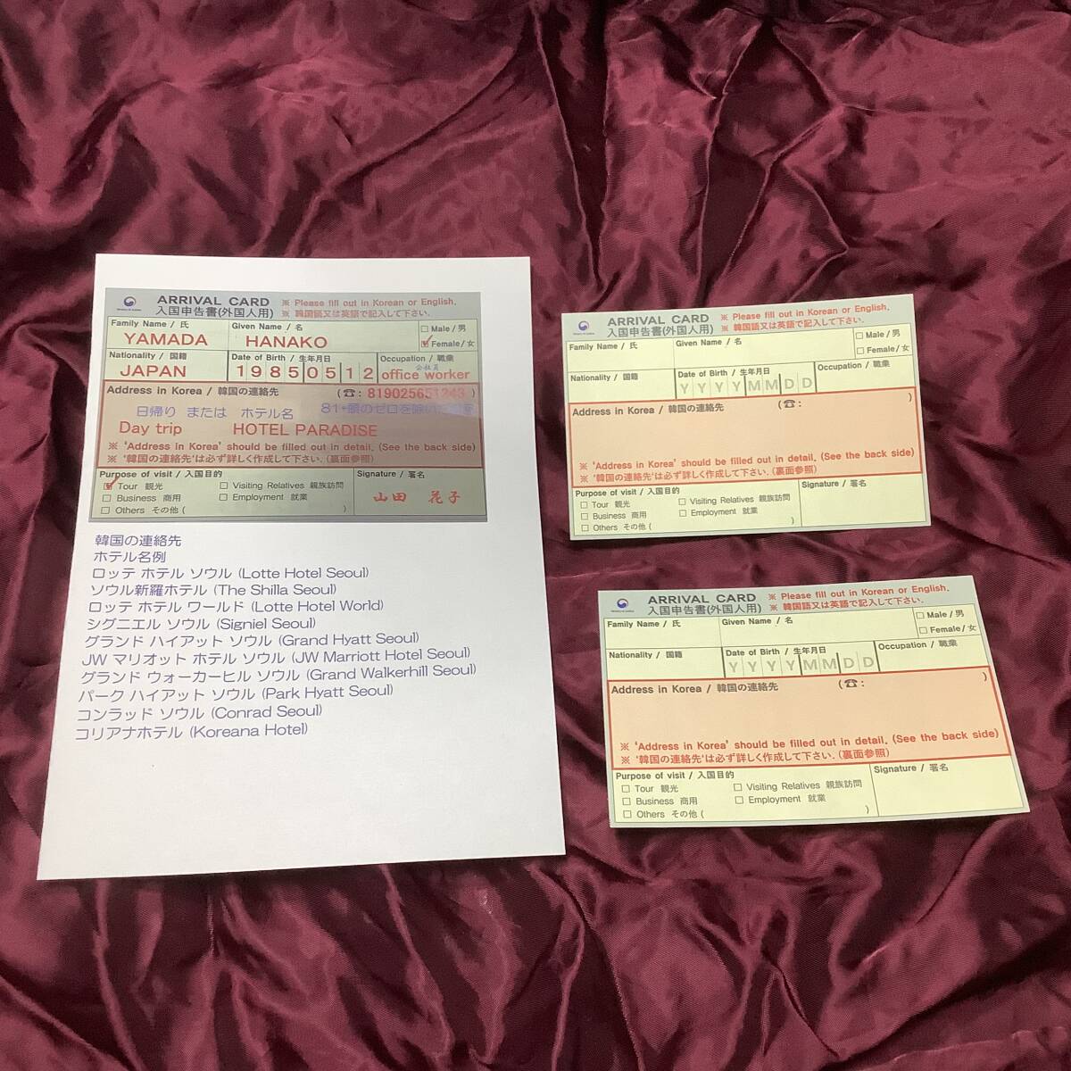 韓国入国カード2枚+入国カード記入方法説明書のセット