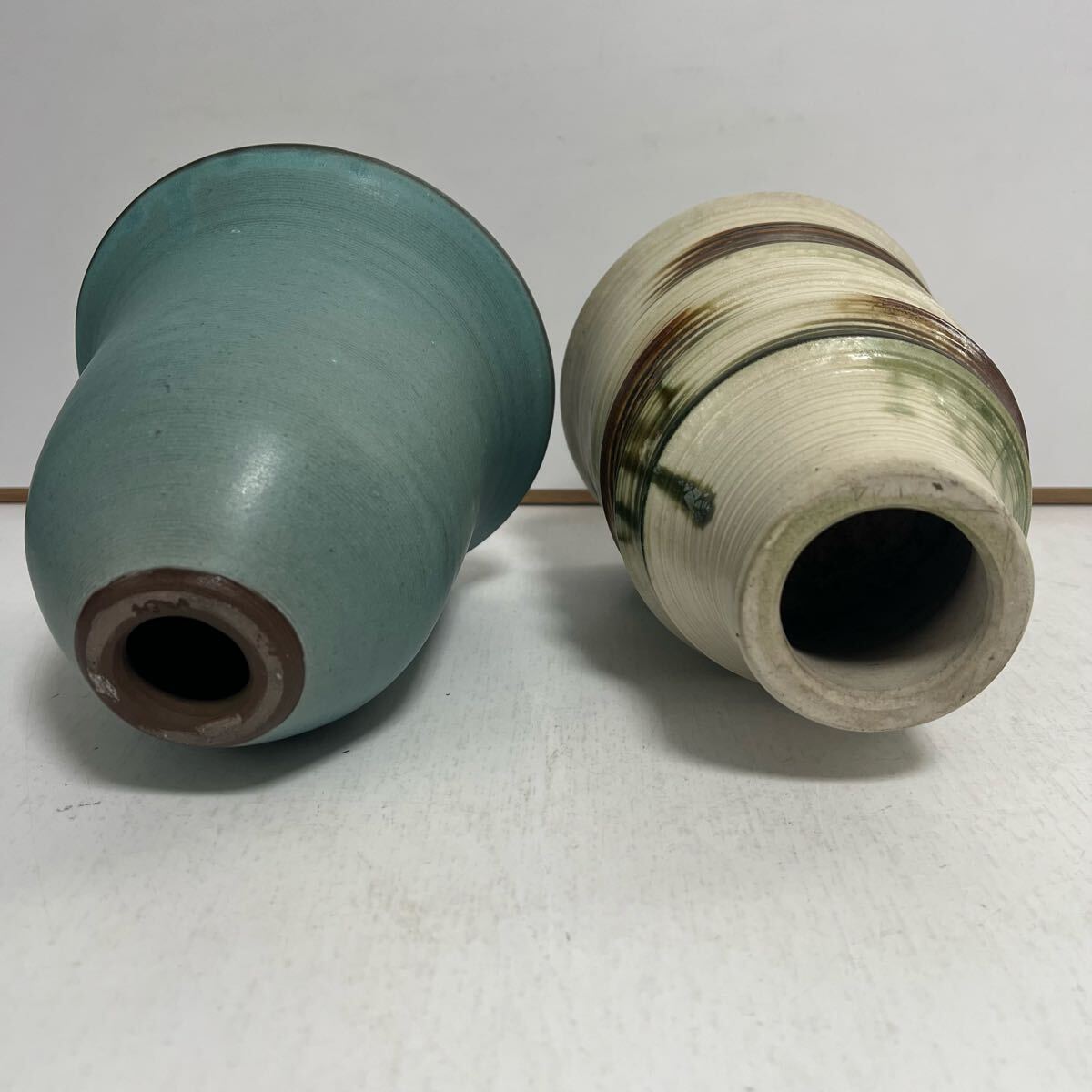 作家物 在銘不明★益子焼 青磁 フラワーベース2個セット 花器 花瓶 陶器 高台 水盤 生け花 上杯 高台杯 ひびあり