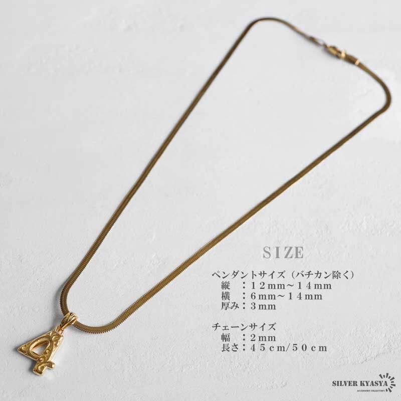 | サイズ | ●ペンダントサイズ(バチカン除く) 縦:12mm~14mm 横:6mm~14mm 厚み:3mm ●チェーンサイズ 幅:2mm 長さ:45cm/50cm |