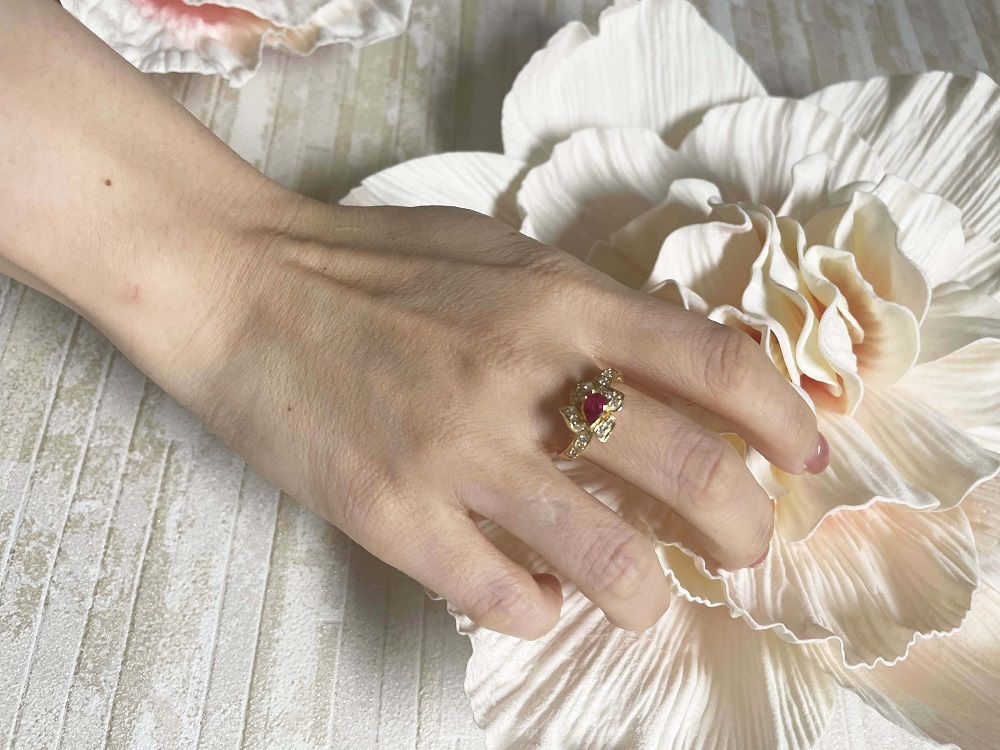 コメント | 深紅のルビーと脇石のダイヤモンドのコントラストが映えるK18リングが入荷しました。ダイヤモンドのカットが四つ葉をイメージさせ着けているとハッピーな気持ちになります。 ~出品担当廣田より~ 着け心地も良く、普段使いからちょっとしたお食事会等幅広く活躍してくれます。 | ||