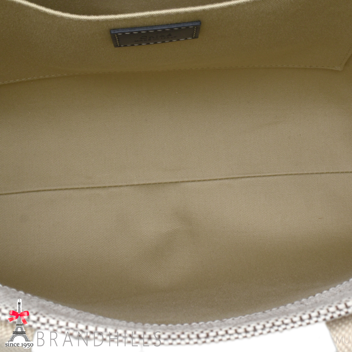 キャンバスにシャイニーカーフスキンの飾り紐をあしらったWoodyミディアムトートバッグ。
