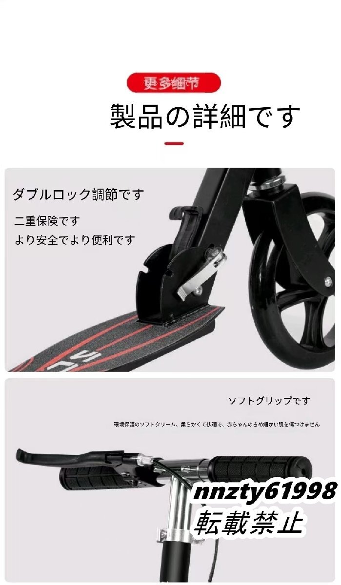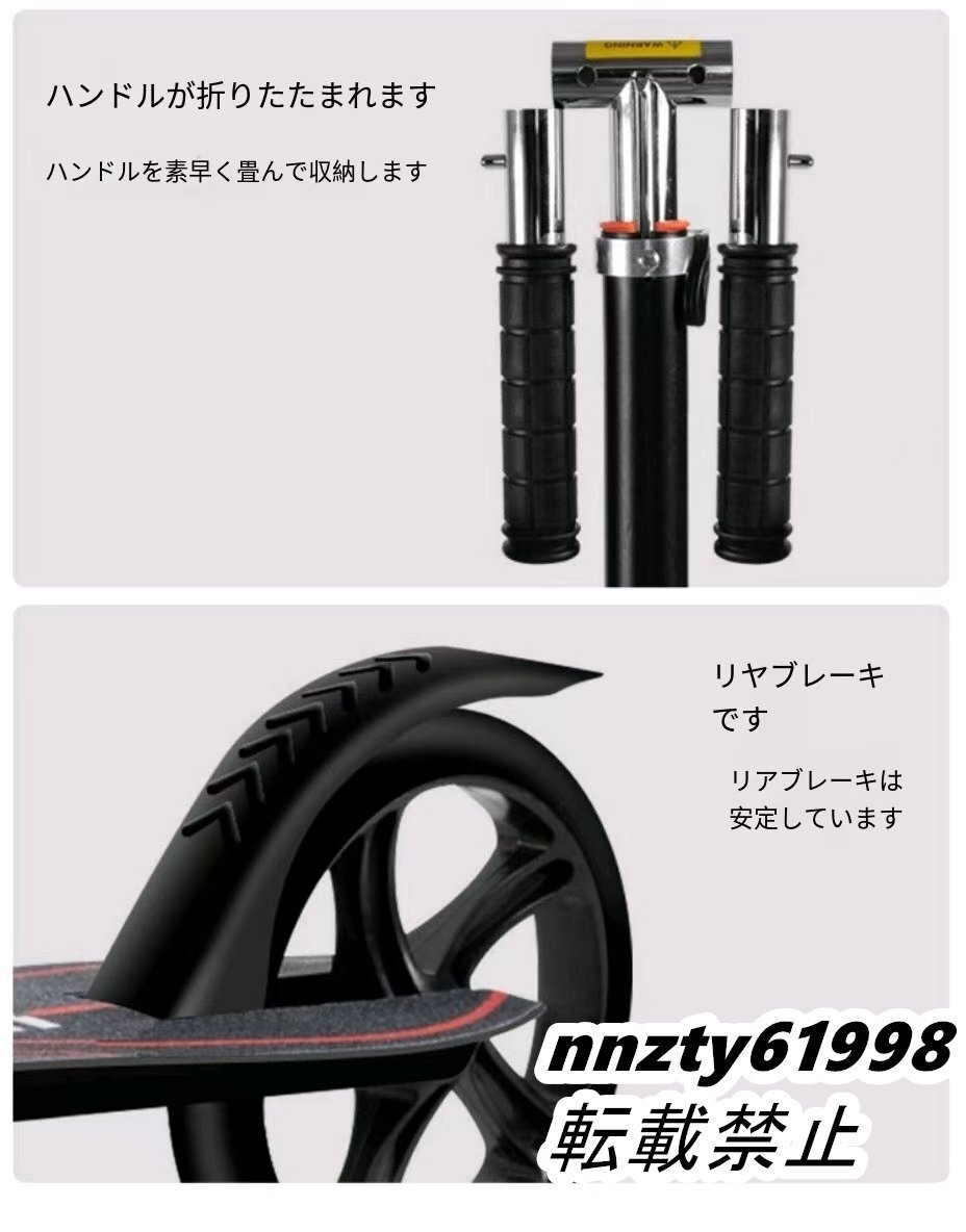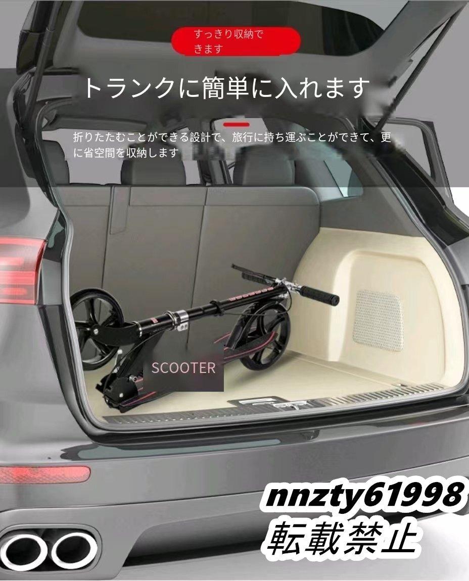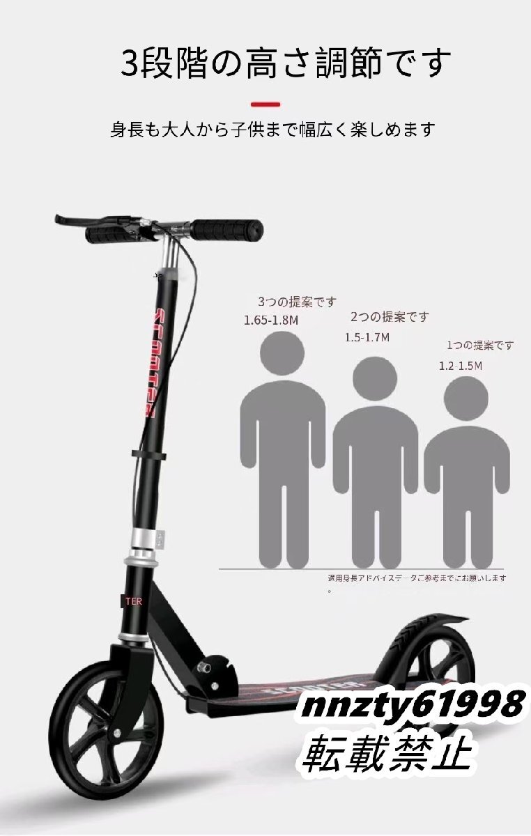 まとめ: この大輪2輪の折りたたみ式スクーターは、都市での移動を快適に、そして安全にサポートします。手動ハンドブレーキと大きな車輪で、安定した走行が可能です。成人から子供、青少年まで、誰でも簡単に使えるこのスクーターは、日常の移動や通勤、通学に非常に便利な選択肢です。