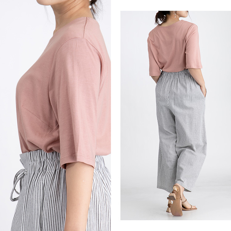 ・程よい伸縮性とレーヨン混ならではの少ししっとりとした質感が肌なじみ良く、シンプルなデザインは普段使いにピッタリ