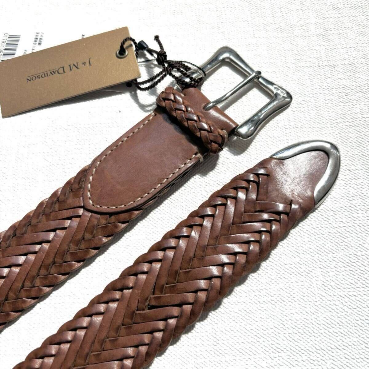 J&M DAVIDSON創業時から人気を博している手編みのメッシュベルト、ENVELOPE BUCKLE TIP END エンベロープ バックル チップ エンド 38mmです。上質なカーフレザーを熟練の職人が1本1本丁寧に編んで仕上げており、独特の曲線を描くバックルやベルトの先のプンターレ(メッキ加工)はブランドのアイコンにもなっています。