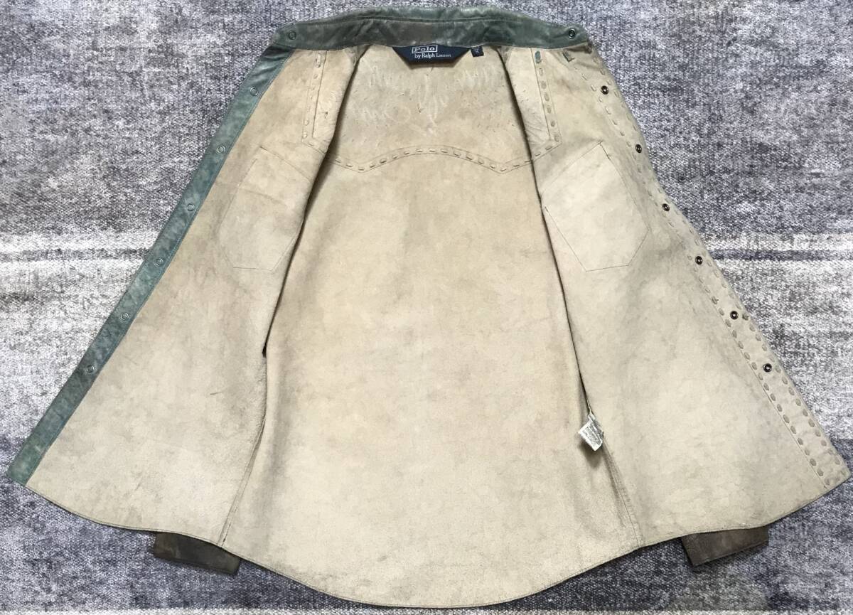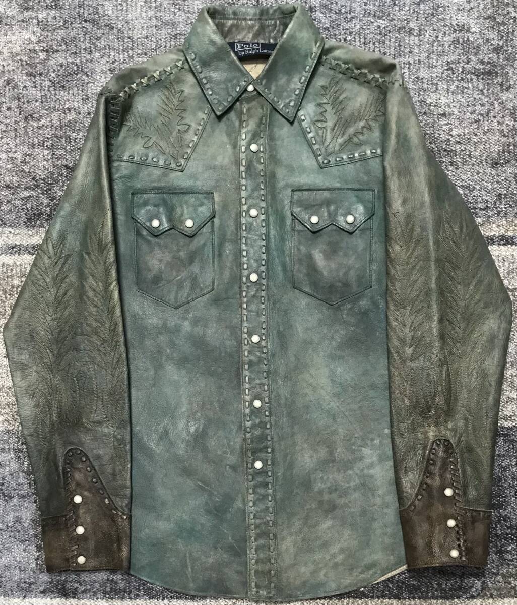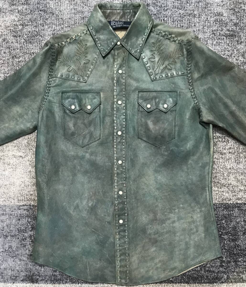 幻 衝撃の1着 最高の男服 超稀少種 超スペシャル RRL元ネタ 深緑&茶 90's vintage ★ Polo by Ralph Lauren ★ vintage加工 ダメージ加工 エンブロイダリー 刺繍 レザーウエスタンシャツ レザージャケット M です。