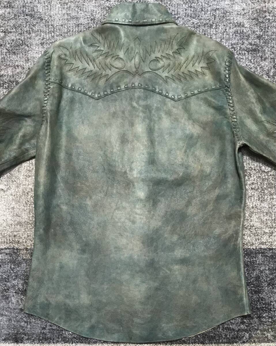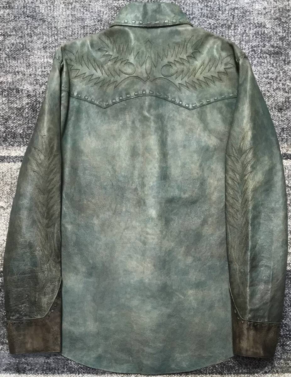 凄まじいvintage加工に絶妙な色味の塩梅、完璧な刺繍と、ラルフローレンが展開したレザーシャツの中でも「トップオブトップ」と評価しても過言では無い「衝撃の1着」です。
