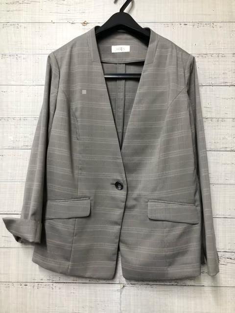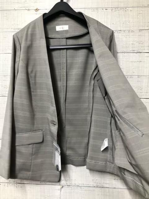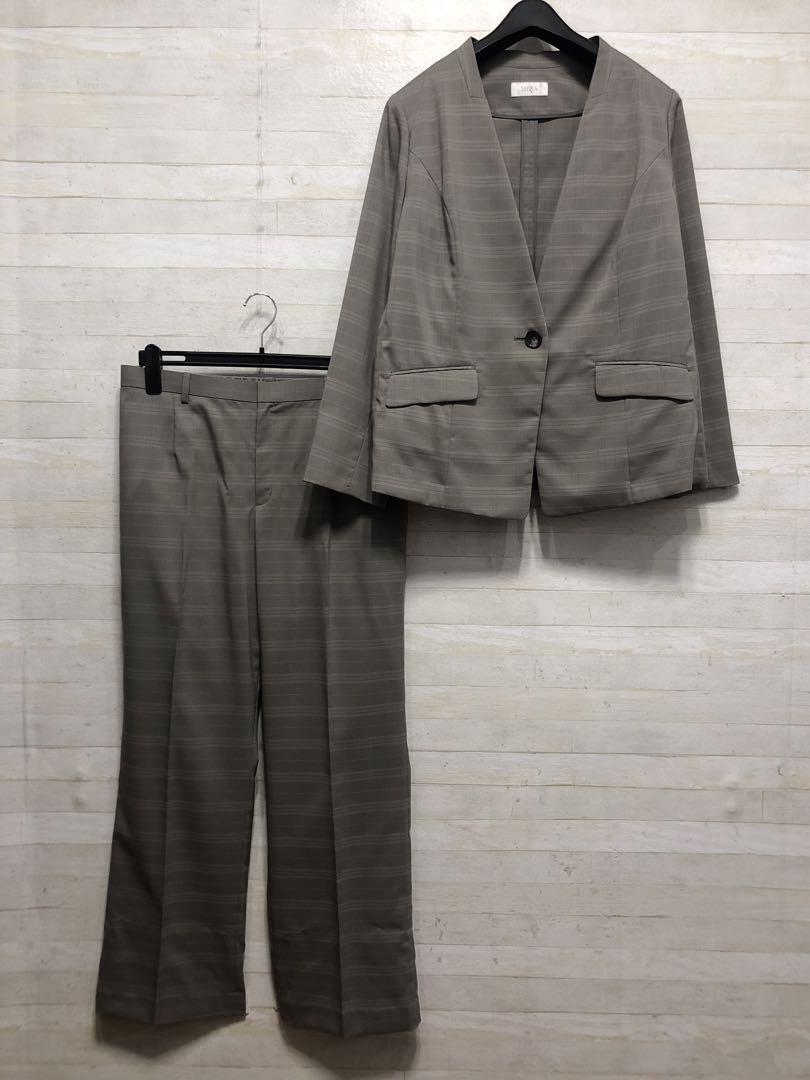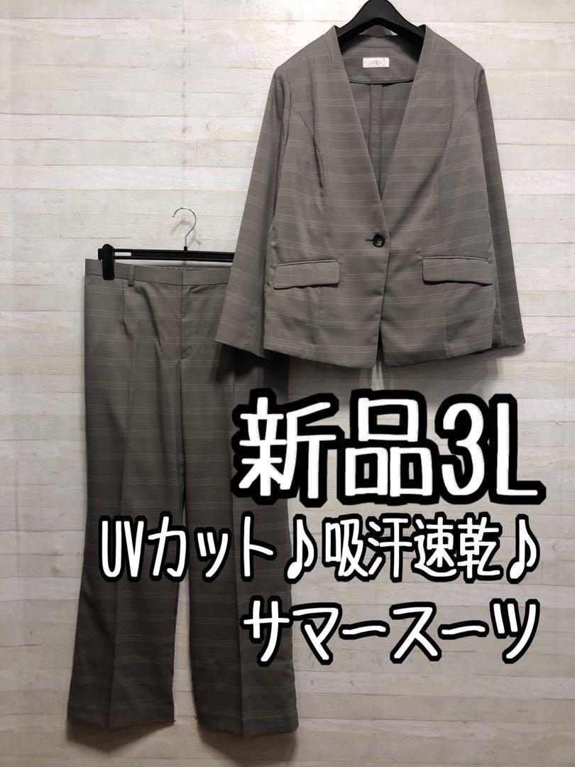 新品☆3L♪グレージュ系サマースーツ♪ノーカラーパンツスーツ♪オフィス◯G302