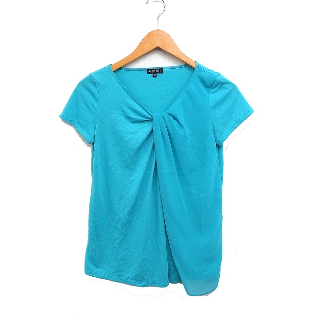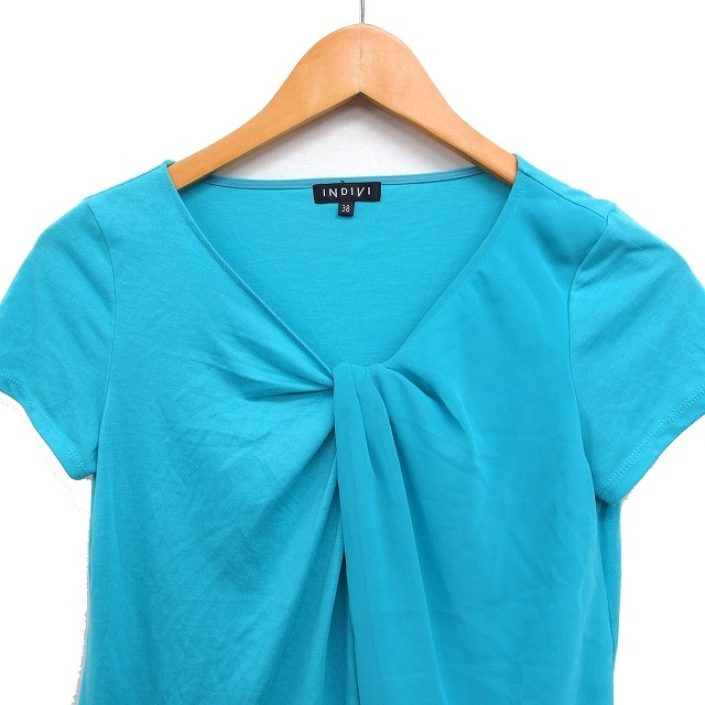インディヴィ INDIVI ツイストVネック カットソー Tシャツ 半袖 切替シフォン 無地 38 ターコイズブルー /FT15 レディース